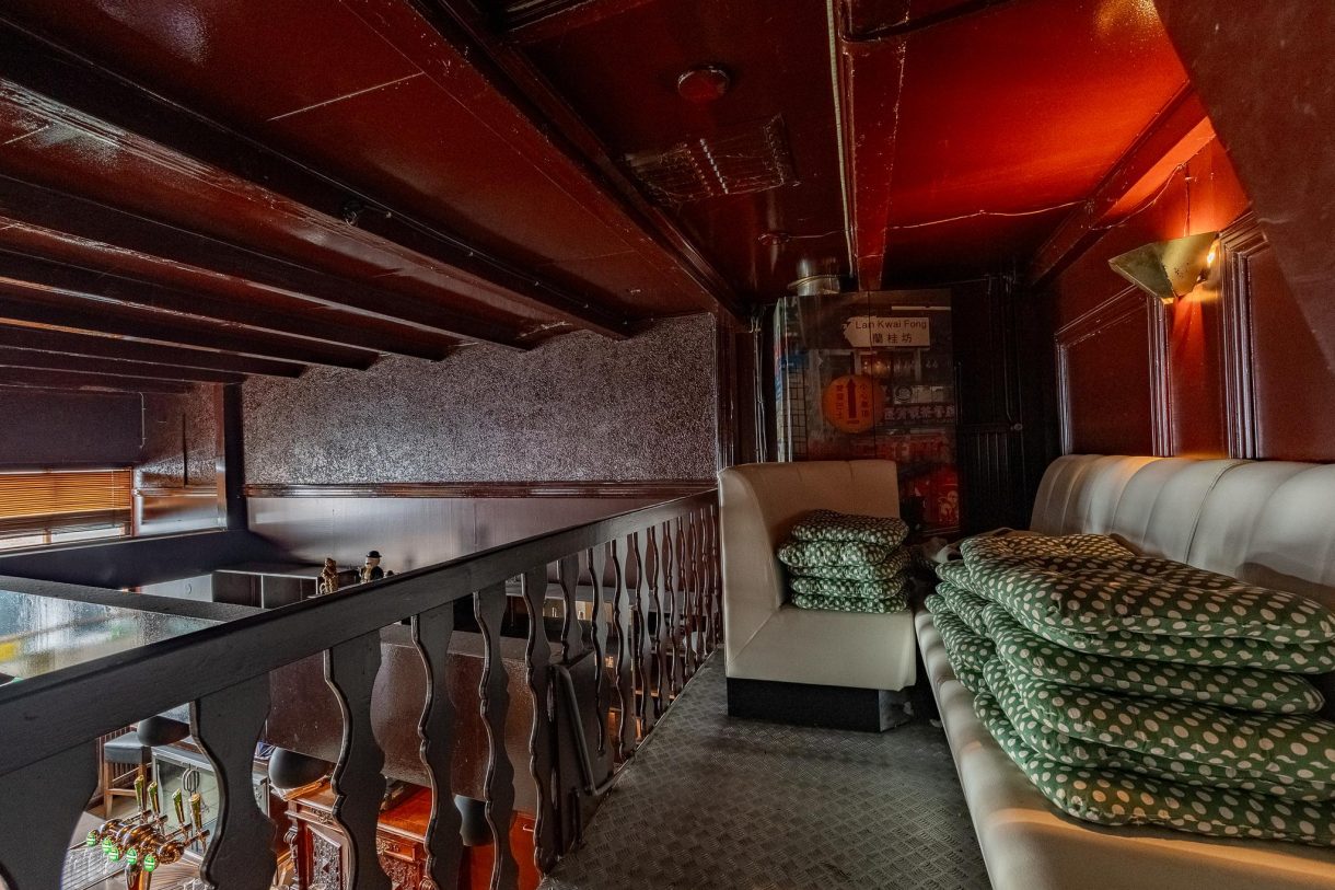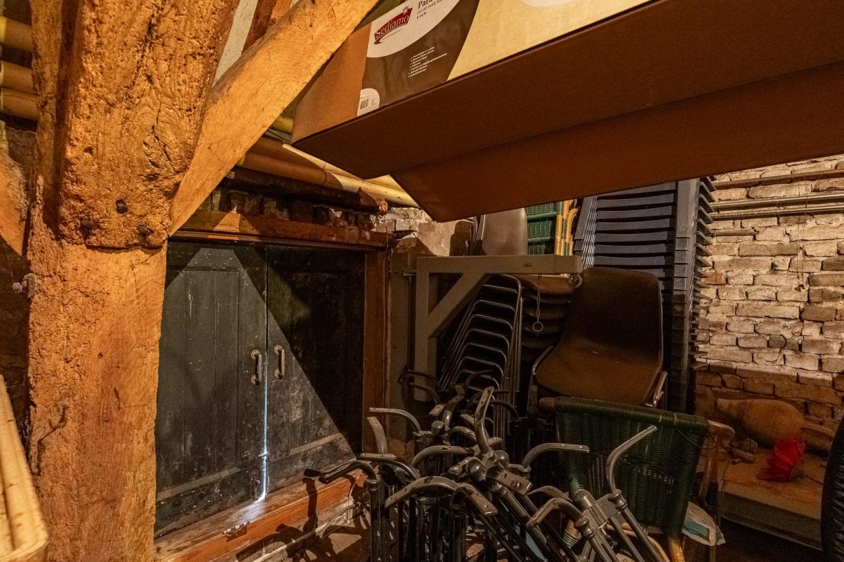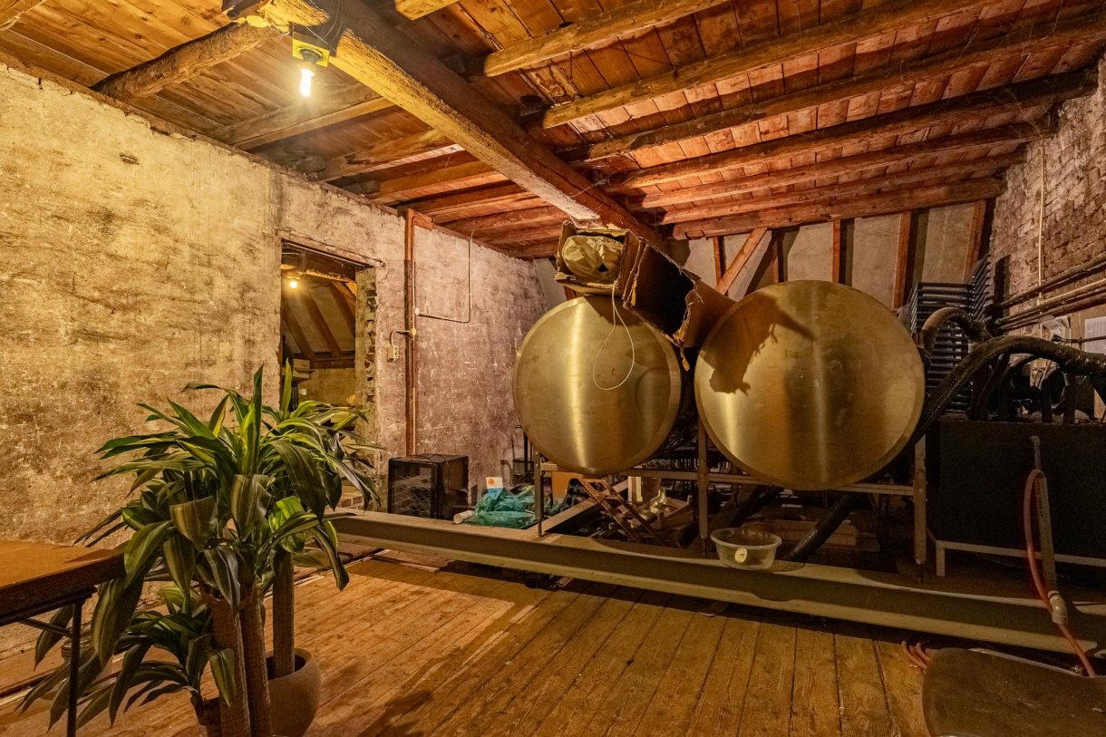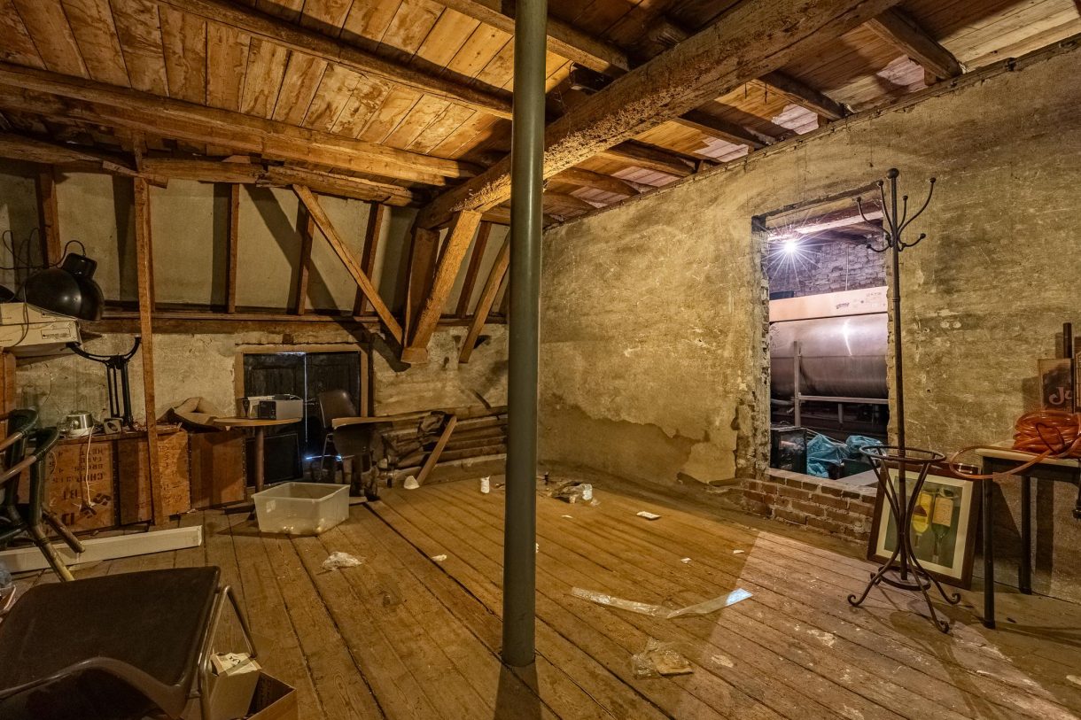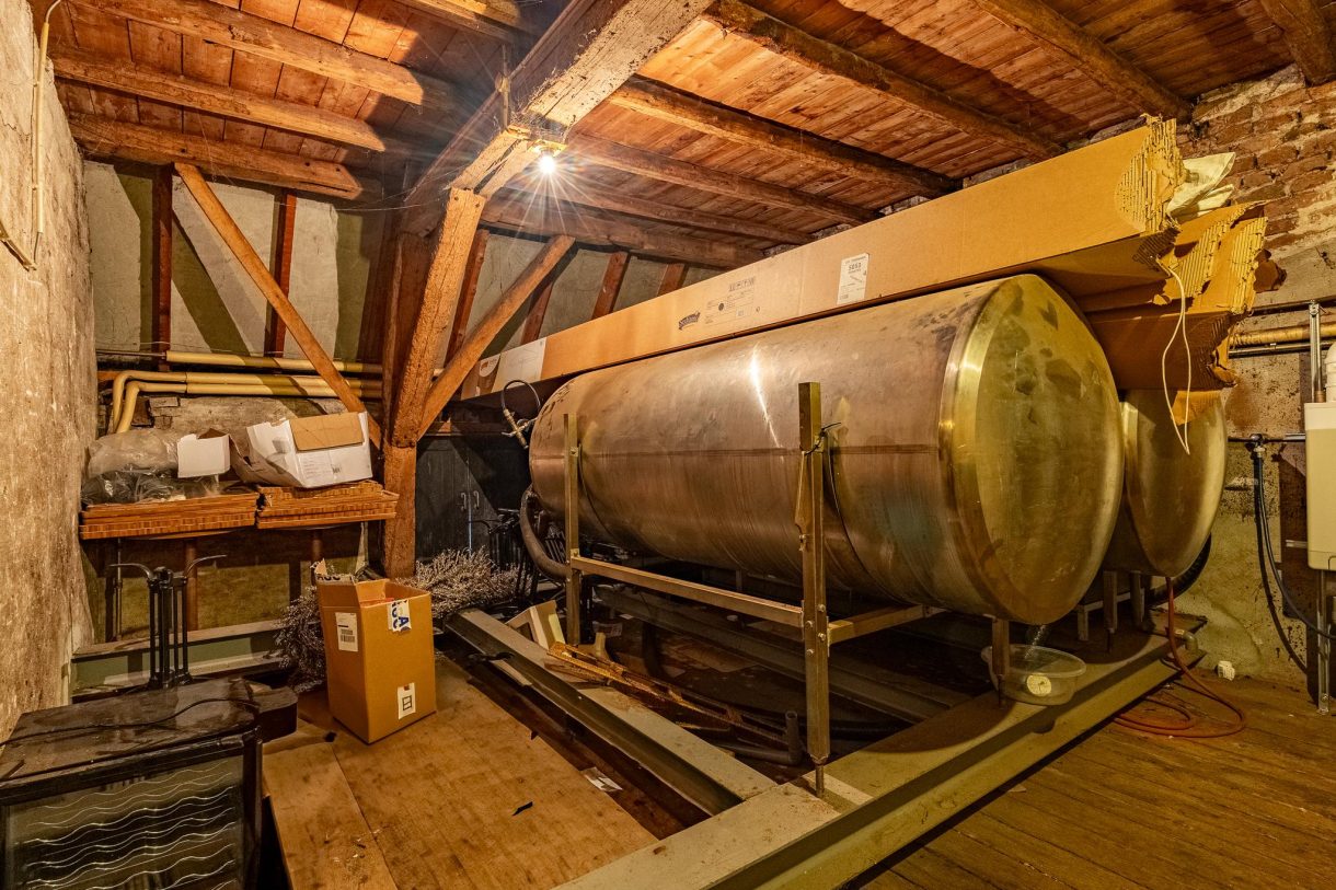 Vervolgens gaat een trap naar de eerste verdieping, houten vloer met bieropslagtanks, verder in gebruik als bergzolder.