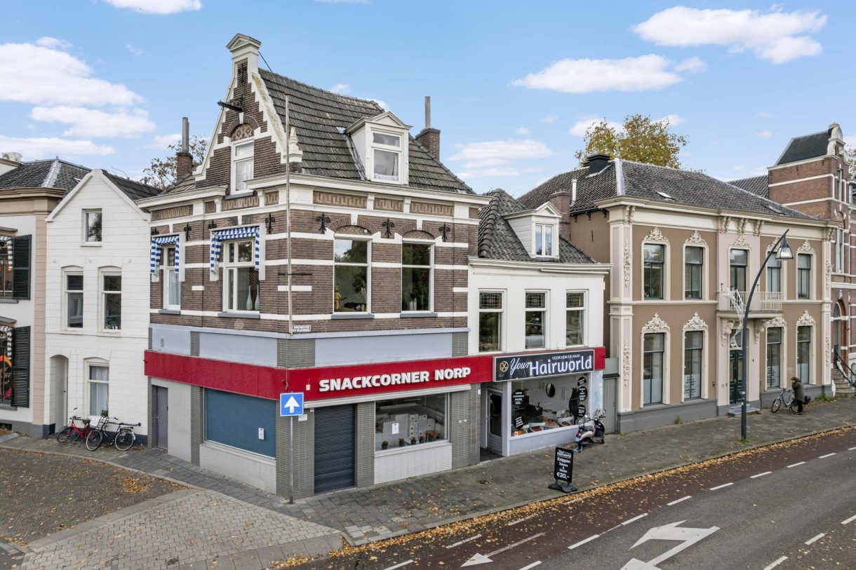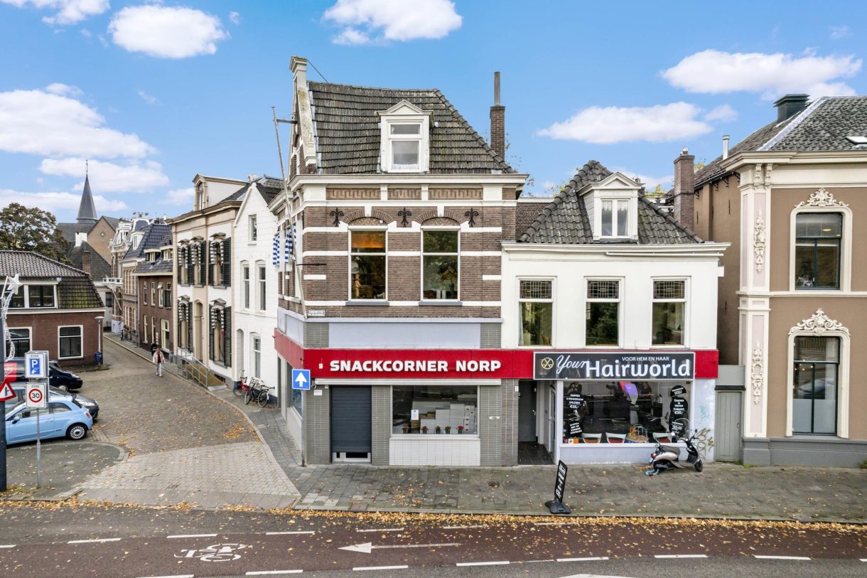 Opvallend gelegen karakteristiek bedrijfsobject met authentieke gevels en fraai metselwerk, bestaande uit een tweetal bovenwoningen en twee gescheiden winkels/bedrijfsruimten, waarvan een in verhuurd als kapsalon.