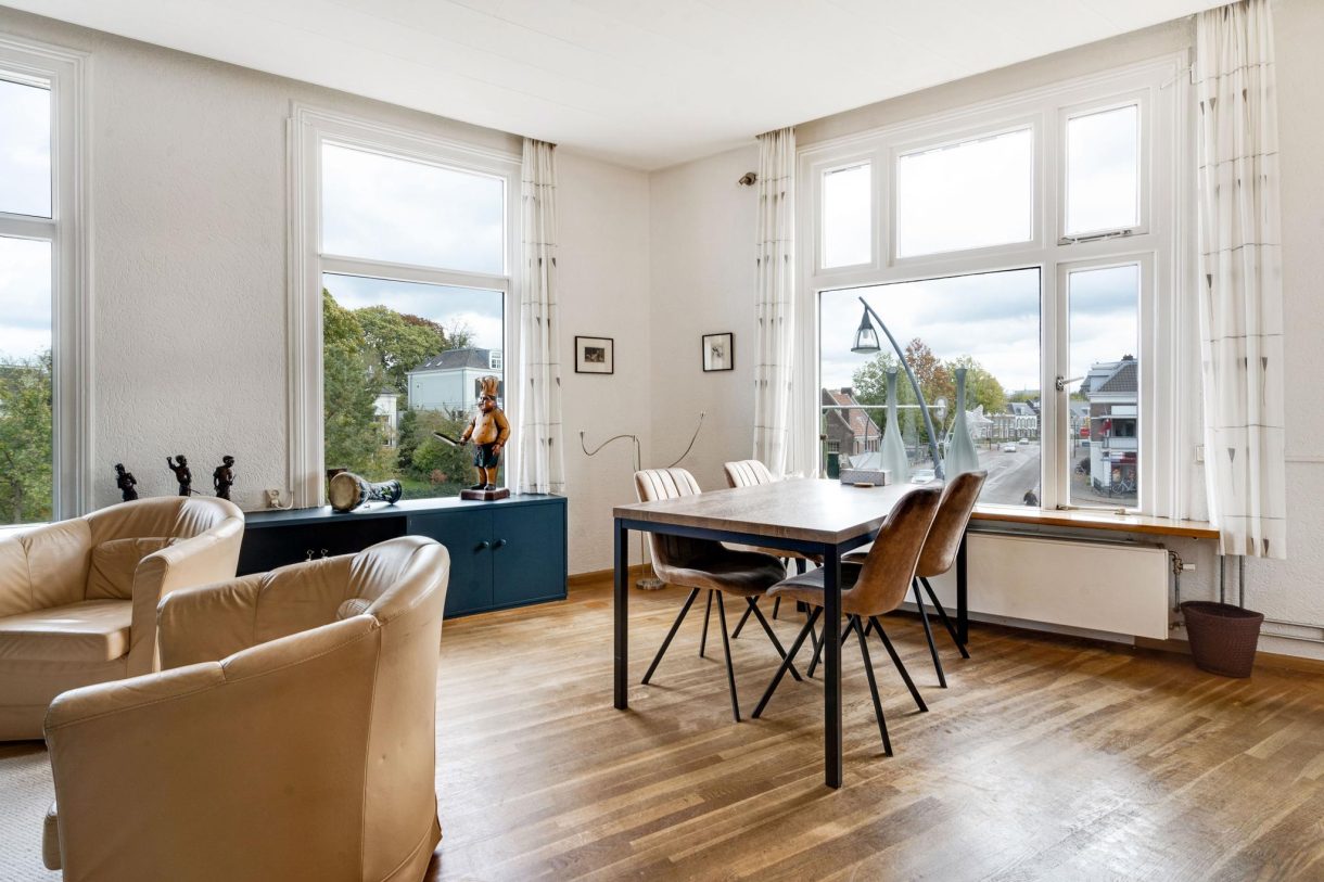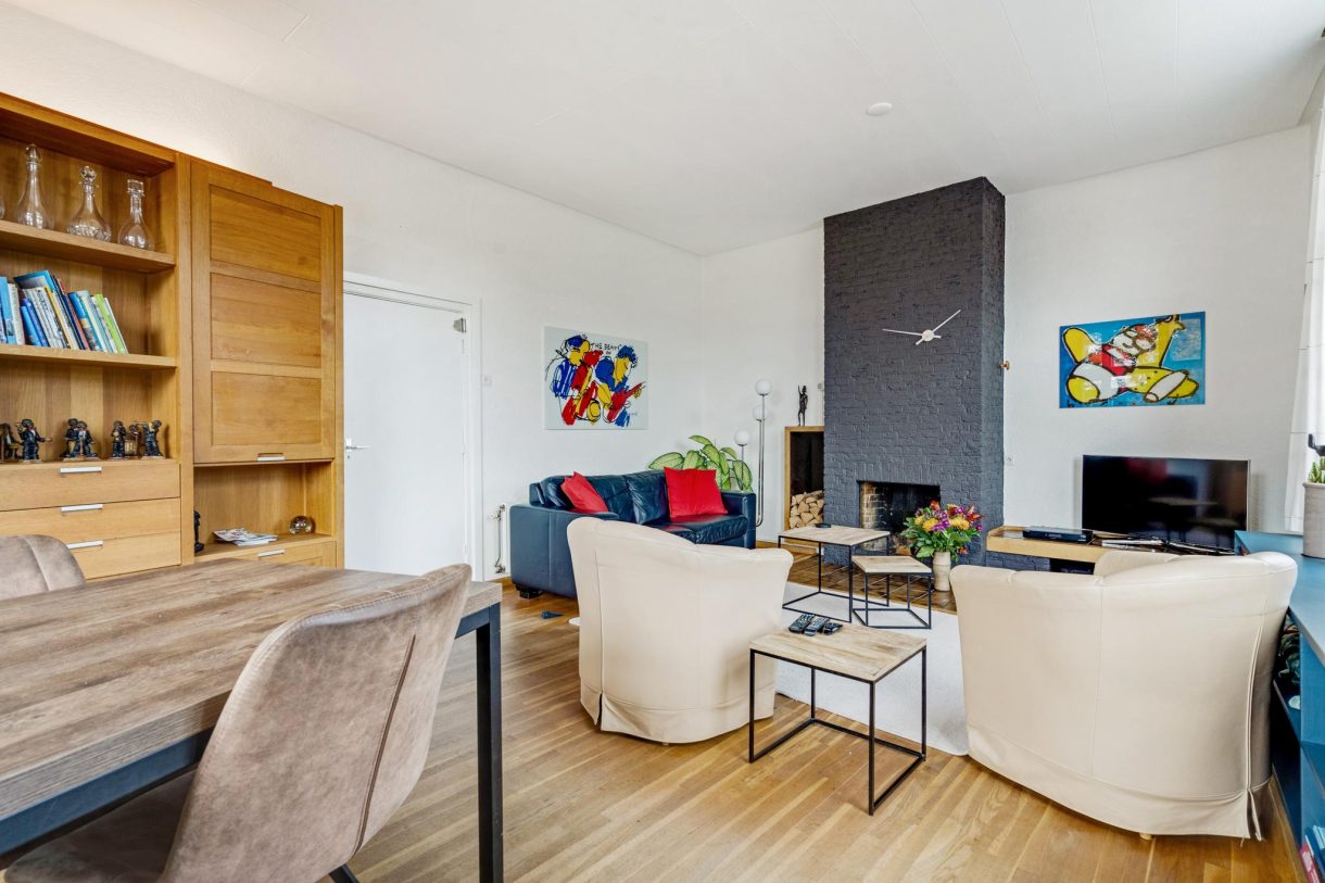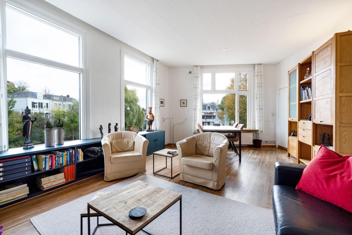 hal, toilet, zitkamer met parketvloer, open haard en schitterend uitzicht over de stadgracht en de singel;