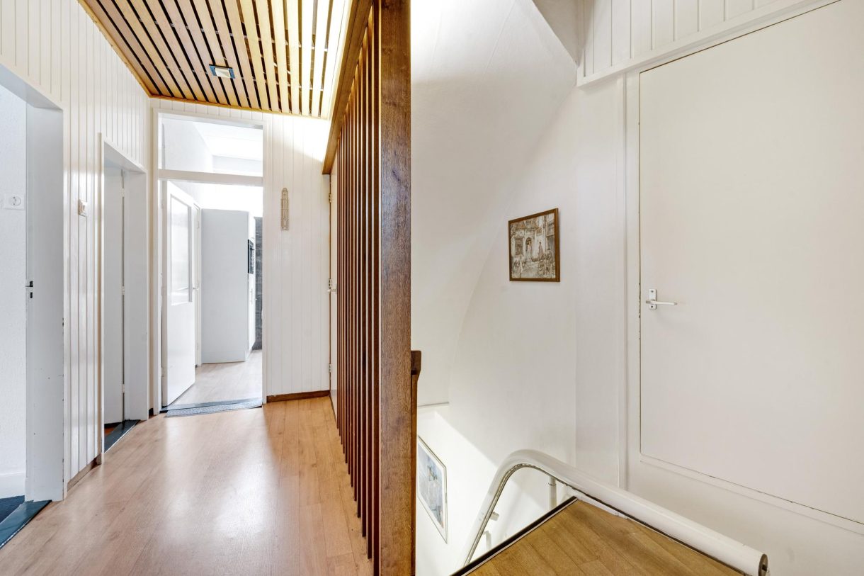 vaste trap naar verdieping met grote hal/overloop, 3 slaapkamers ; grote badkamer met ligbad, wastafel, toilet en ruimte voor wasmachine.
