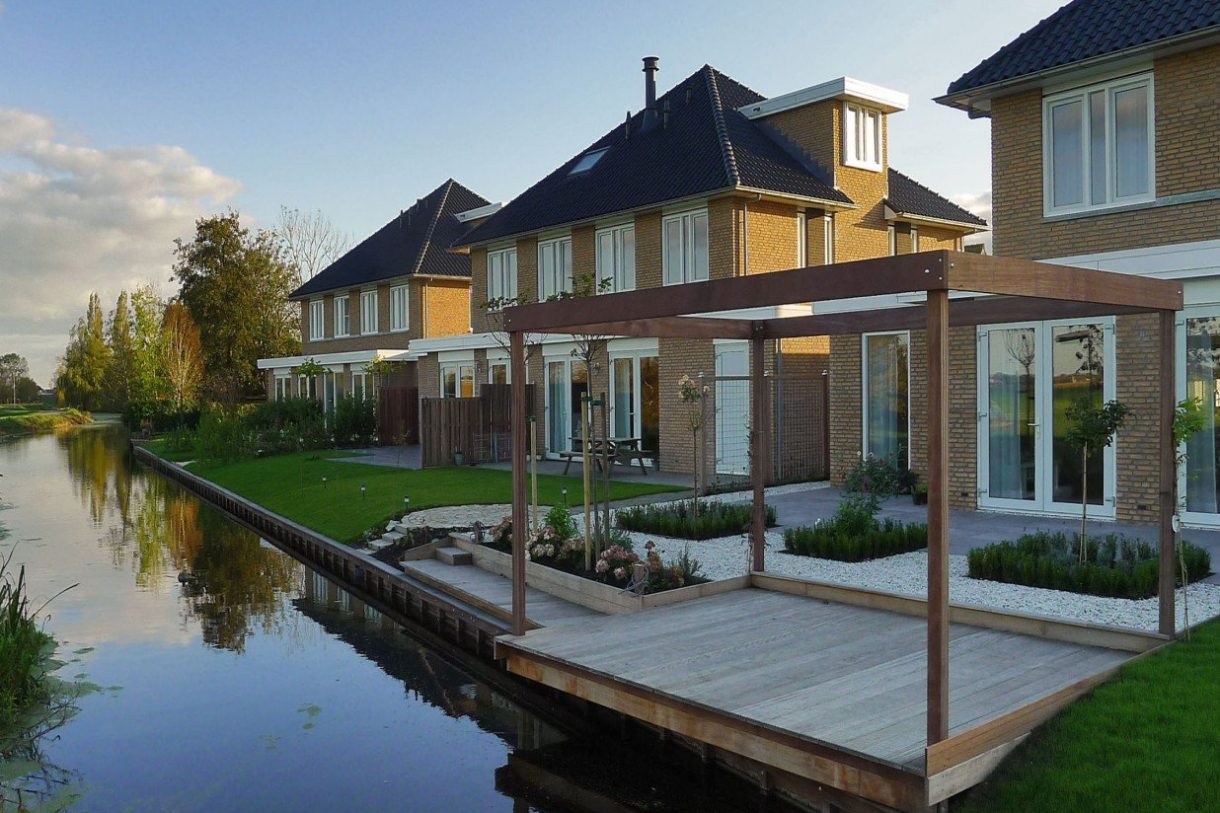 De tuinen van de tweekappers zijn bewust aan de polderkant gesitueerd (noord- oostoriëntatie) om optimaal te profiteren van het uitzicht over de karakteristieke polder. In de winter met sterk ijs, kan u zo de schaatsen onder binden en weg schaatsen richting de Nieuwkoopse Plassen.