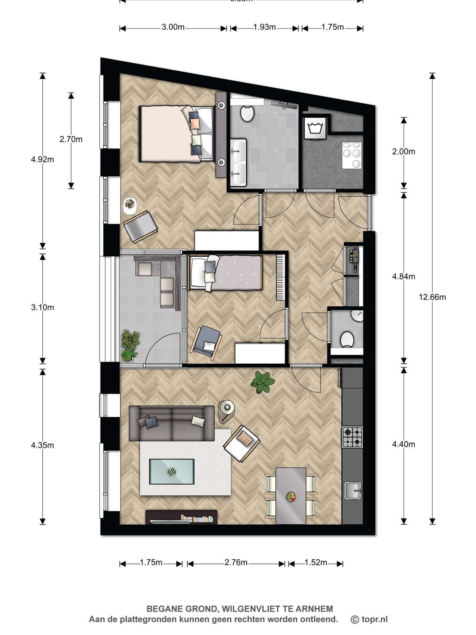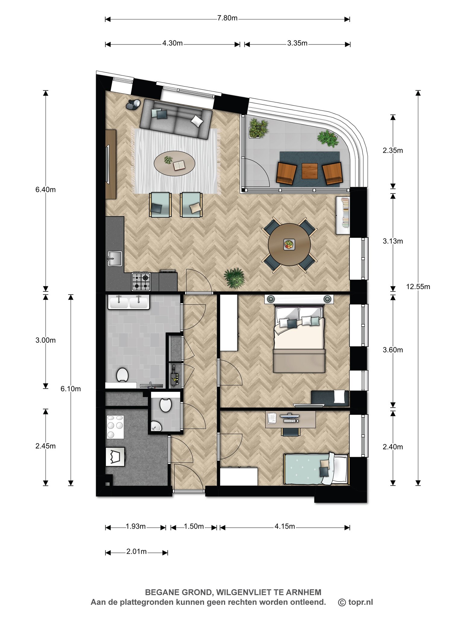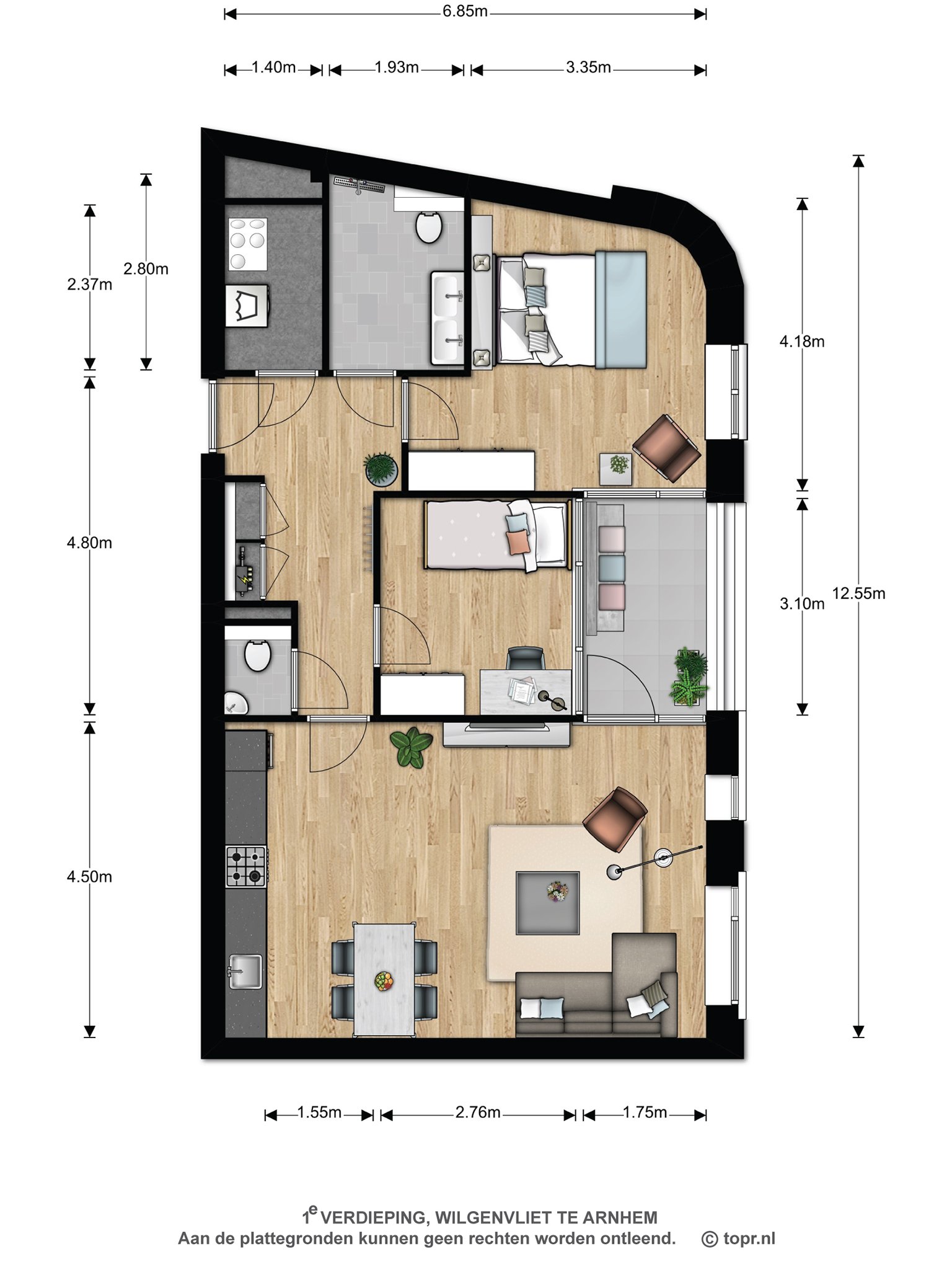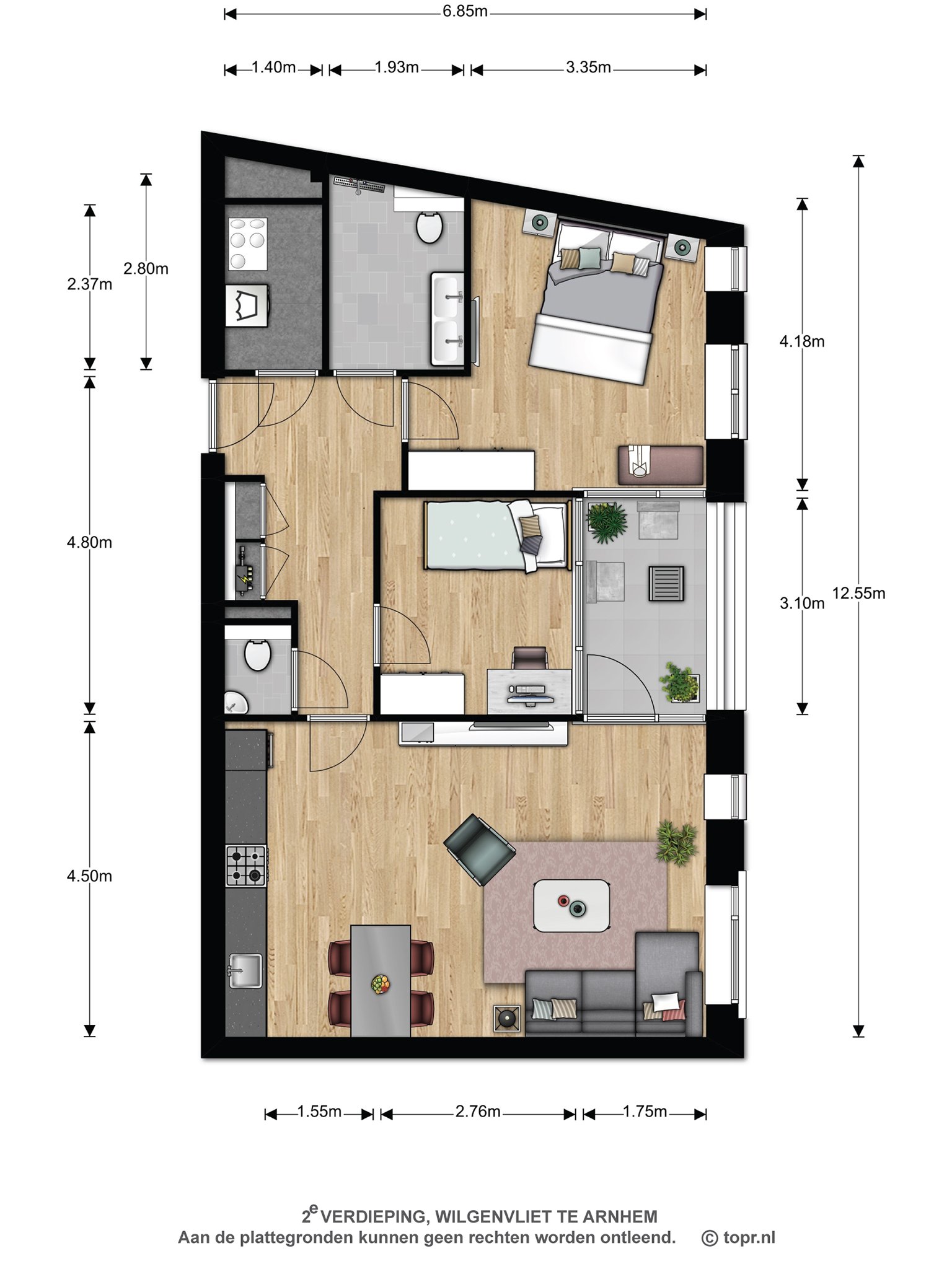 De woonkamer met open keuken in dit appartementstype is 37 m2. De vele ramen rondom maken het een licht appartement. De keuken, in een hoekopstelling, is voorzien van aansluitingen voor elektrisch koken, de koelkast en de vaatwasser. Vanzelfsprekend ontbreekt ook hier een balkon niet. Dat biedt je 8 m2 buitenruimte, genoeg om een terrastafel voor vier personen te plaatsen! Via de royale entreehal ( 12 m2) ga je naar de drie slaapkamers. De grootste daarvan heeft een oppervlakte van 15 m2, de andere twee zijn ongeveer 10 tot 12 m2 groot. De badkamer is hier 6 m2 groot. Een douche, tweede toilet en wastafel behoren bij de inrichting ervan. Bij een groter appartement hoort ook meer bergruimte: die is hier maar liefst 6 m2 groot. Daar kun je dus aardig wat in kwijt.