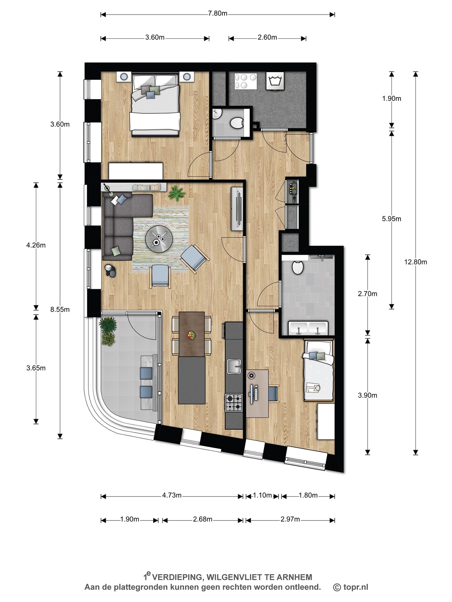 Op de zuidwestelijke hoek van Parkpaviljoen Wilgenvliet zit op iedere verdieping, vanaf de begane grond tot en met de 5e, een appartement van circa 90 m2. Door zijn ligging is het een zonnig en licht appartement met veel daglicht. De ruime woonkamer met open keuken is 40 m2 groot. De keuken, in een hoekopstelling, is voorzien van aansluitingen voor elektrisch koken, de koelkast en de vaatwasser. Je balkon, gelegen op het zuidwesten, is maar liefst 8 m2 groot, waarbij je bijna de hele dag zon hebt. Dat wordt veel buiten zitten, met uitzicht over het water. Ook dit type appartement heeft twee slaapkamers, waarvan de grootste bijna 15 m2 is en de tweede bijna 10 m2. Een badkamer van dik 6 m2, een berging annex technische ruimte en het tweede toilet in de hal maken dit appartement compleet.