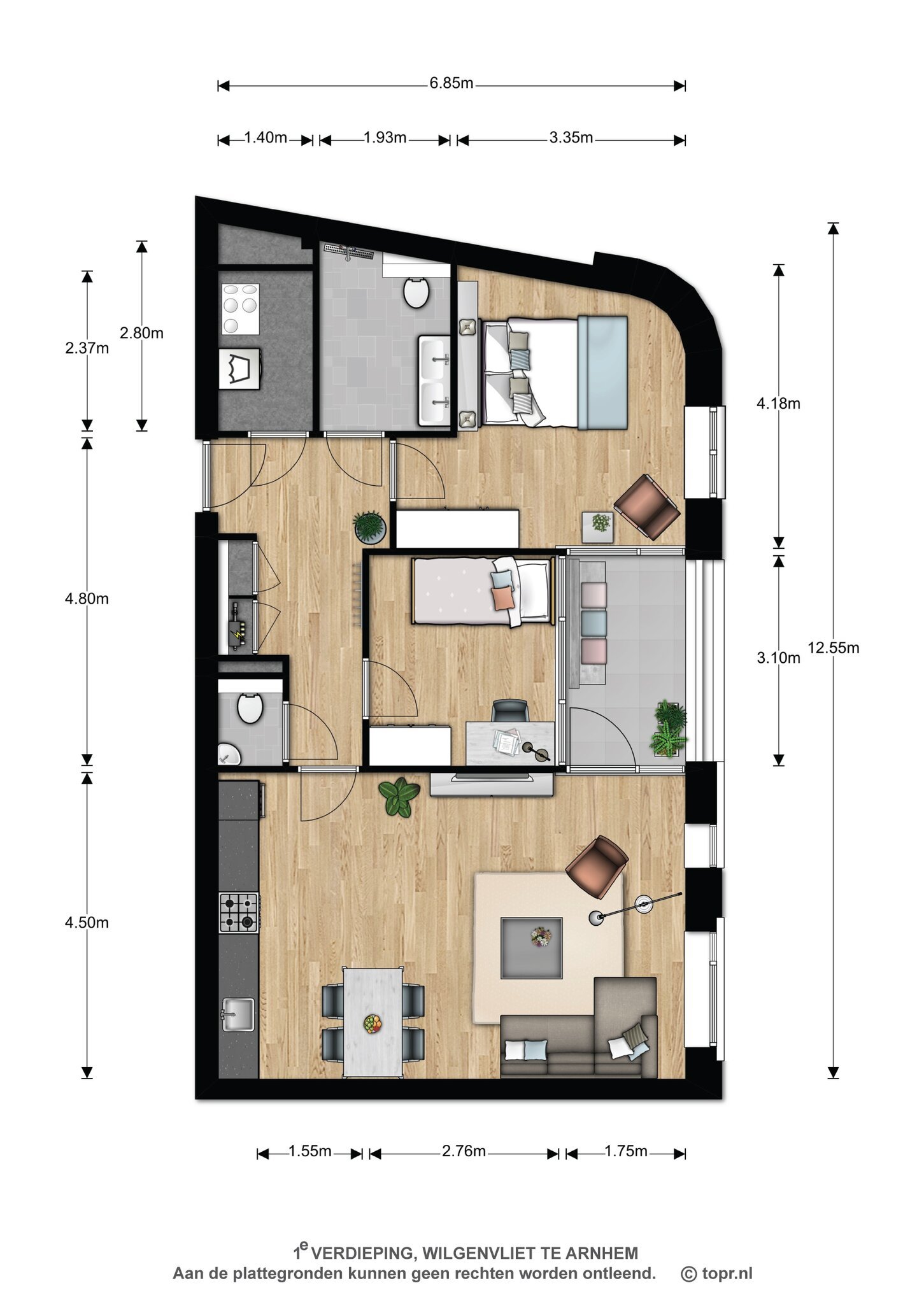Aan de oostzijde van Parkpaviljoen Wilgenvliet heb je op de 1e tot en met de 5e verdieping de keuze uit 10 3-kamer appartementen met een oppervlakte van 81 m2, met veel glas rondom. Hierbij heb je veel leefruimte in de woonkamer met open keuken die samen 31 tot 34 m2 groot is. Zoals bij alle appartementen is de keuken voorzien van de aansluitingen voor elektrisch koken, de koelkast en de vaatwasser. Op de hoek van je woonkamer is een groot balkon van 8 m2 met vrij uitzicht. Bij de helft van de appartementen ligt dit balkon op het zuidoosten, bij andere helft op het noordoosten. Dat wordt ās ochtends genieten van de opkomende zon, zie je het al voor je? Bij dit type appartementen is de hoofdslaapkamer ongeveer 14 m2 groot, de tweede slaapkamer biedt je 10 m2 ruimte. Ook hier zou je eventueel een werkkamer van kunnen maken. Een compleet ingerichte badkamer van 5 m2 maakt dit appartementstype compleet.