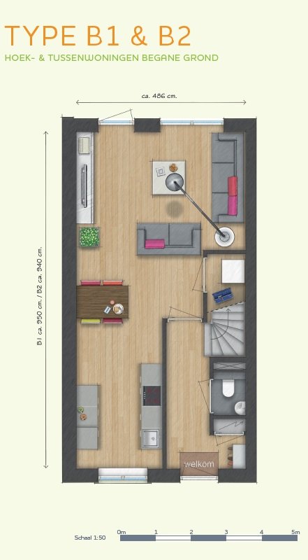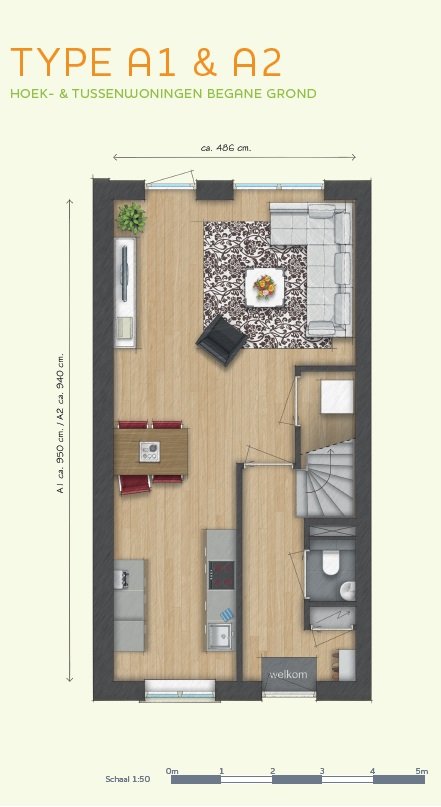 Er is een keuze uit twee typen woningen die weer onderverdeeld zijn in hoek- en tussenwoningen. Wat de beide woningen gemeen hebben is de ruime woonkamer en volop ruimte om te leven op de eerste- en tweede verdieping (woningtype A). Bij beide woningtypes loopt de lichte woonkamer door in de open keuken.