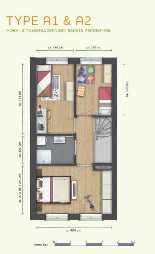 – 1e verdieping hoekwoningen: variant 3 (optie B09) incl. 2 slaapkamers en vast trap naar zolder
