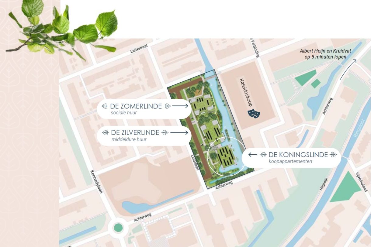 Project De Drie Linden, waar De Koningslinde deel van uit maakt, wordt gebouwd tussen de Achterweg en de Lindelaan, vlakbij het Ashram College. Het winkelcentrum aan het Kennedyplein ligt op een steenworp afstand, evenals de huisartsenpraktijken en het gezellige dorpscentrum. De waterpartij langs De Koningslinde en het daaromheen liggend groen krijgen een metamorfose, zodat u optimaal geniet van het buitenleven.
