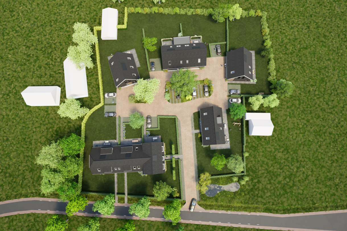 Alle woningen liggen aan een gemeenschappelijk, fraai aangelegd erf, waarvan alle aanwonenden mede-eigenaar zijn. Dit erf biedt niet alleen toegang tot de woningen met tuin, maar er zijn ook parkeerplaatsen op het erf voor gasten.