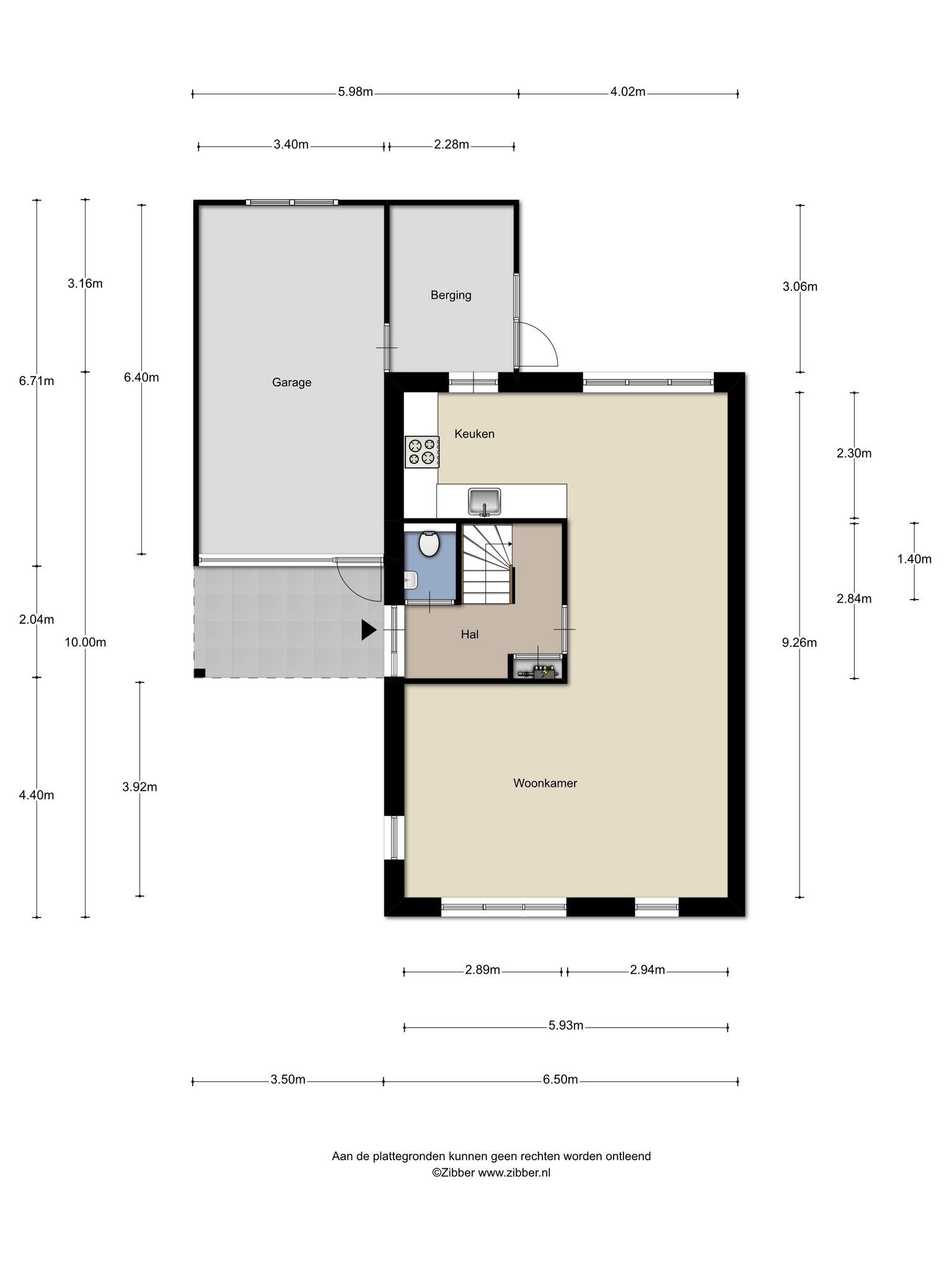 Begane grond: hal/entree met toiletruimte en meterkast, L-vormige woonkamer met open keuken en bijkeuken met doorgang naar de garage.