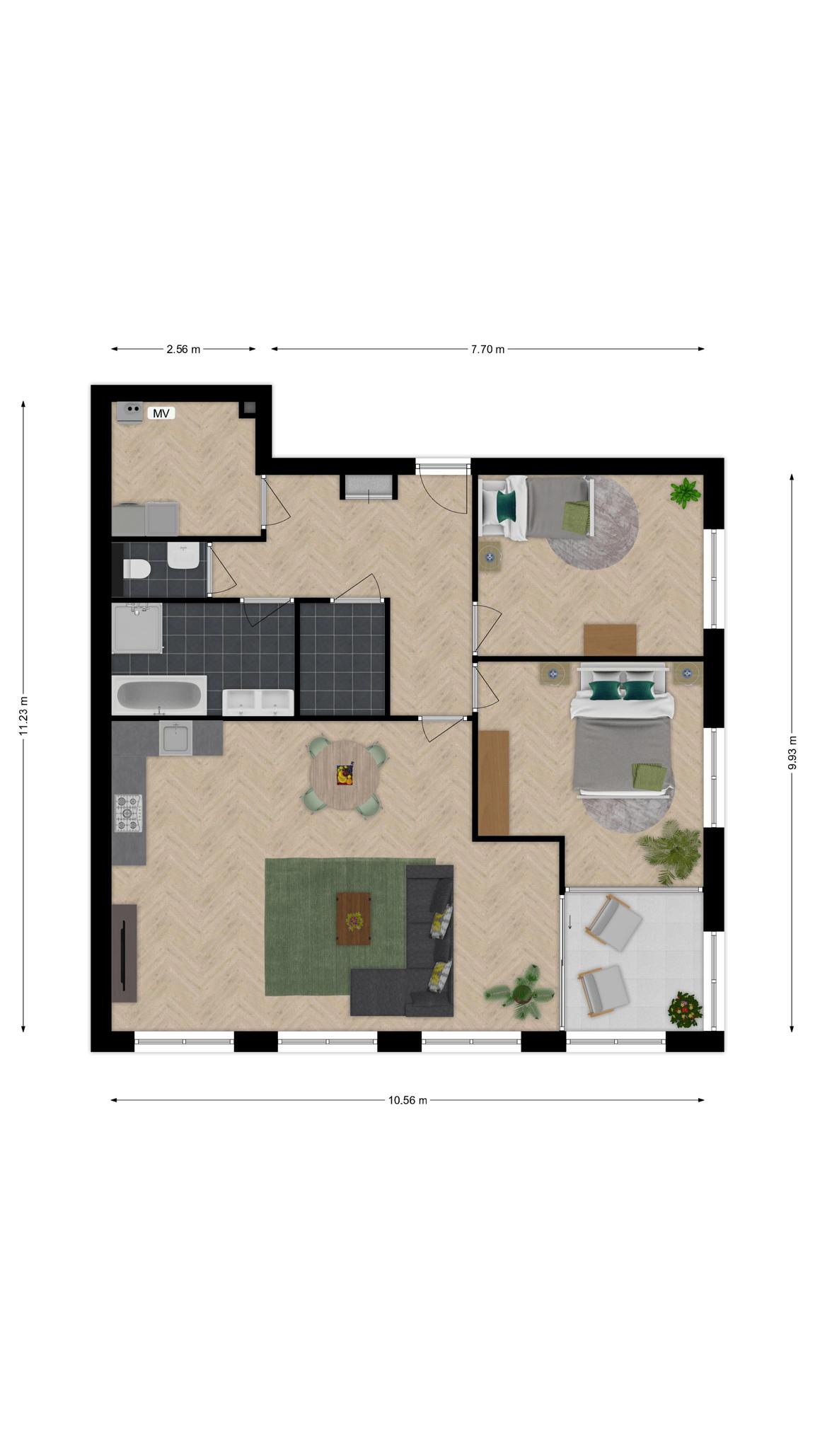 Het complex bestaat uit zes comfortabele appartementen, verdeeld over drie verdiepingen. Elke appartement biedt circa 100 m² woonoppervlakte, een ruime woonkamer met open keuken, twee volwaardige slaapkamers en een loggia. Dankzij de optimale indeling geniet je van licht, ruimte en privacy – of je nu op de begane grond, middenverdieping of bovenste etage woont.
