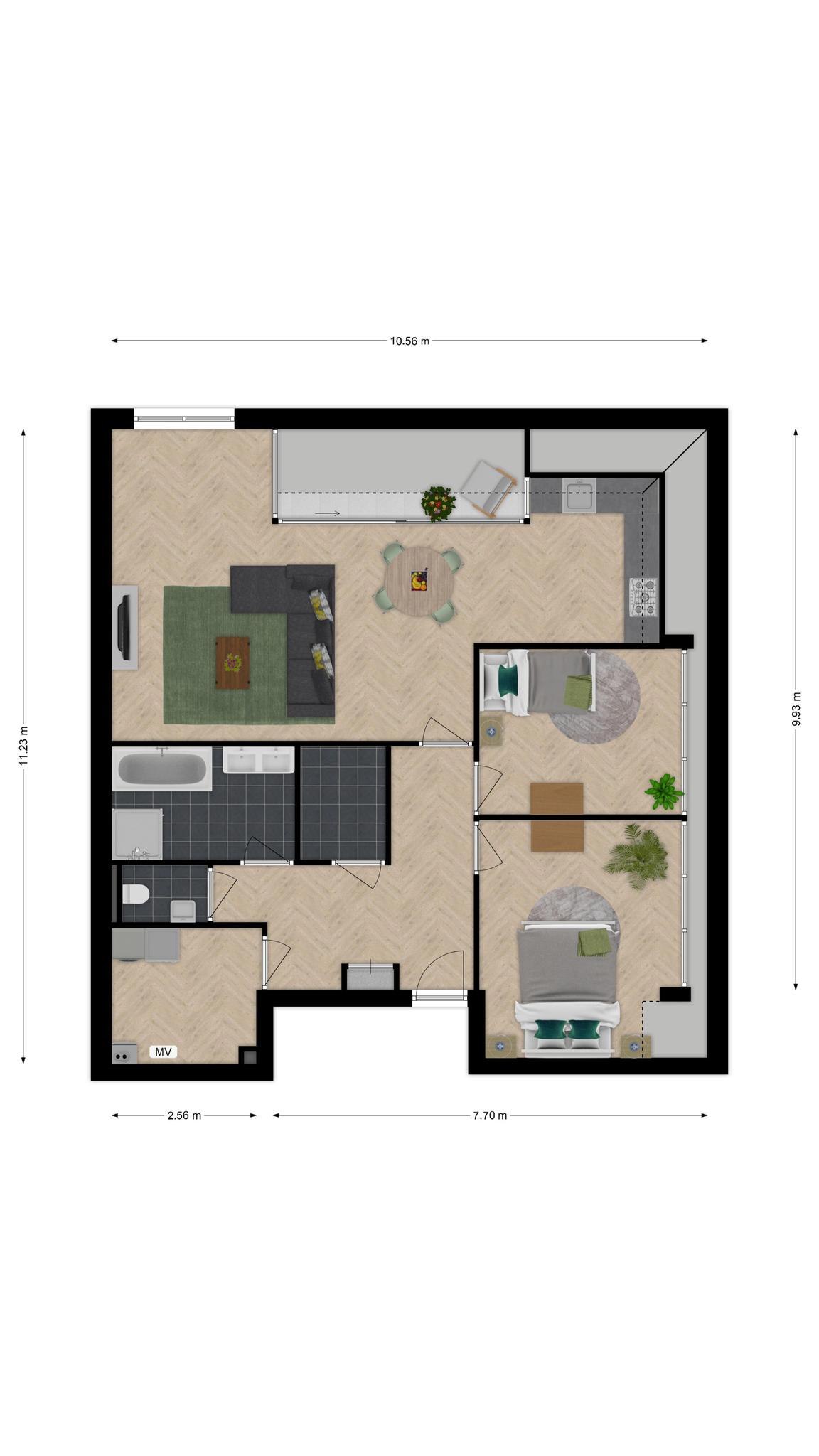 Het complex bestaat uit zes comfortabele appartementen, verdeeld over drie verdiepingen. Elke appartement biedt circa 100 m² woonoppervlakte, een ruime woonkamer met open keuken, twee volwaardige slaapkamers en een balkon/loggia om buiten te zitten. Dankzij de optimale indeling geniet je van licht, ruimte en privacy – of je nu op de begane grond, middenverdieping of bovenste etage woont.