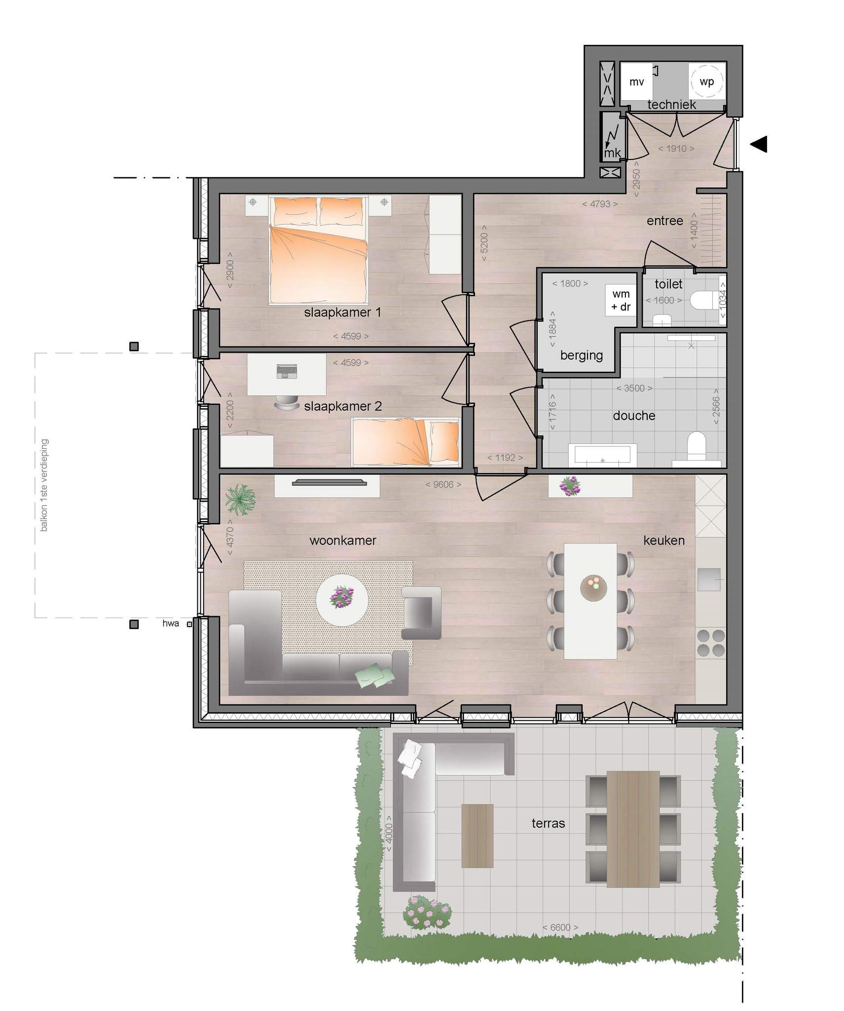Ruim begane grond appartementen van 98 m2 met flink zonnig terras, gelegen op het zuid-oosten van ca. 25 m2 met berging en parkeerplaats in de onderbouw. Start bouw najaar 2021, geplande oplevering voorjaar 2023. De woningen worden zeer energiezuinig en dit appartement beschikt over een warmtepomp die kan verwarmen en koelen via de vloerverwarming. Door 10 eigen zonnepanelen zal de energierekening lekker laag zijn. De appartementen worden compleet opgeleverd met sanitair maar zonder keukeninrichting.