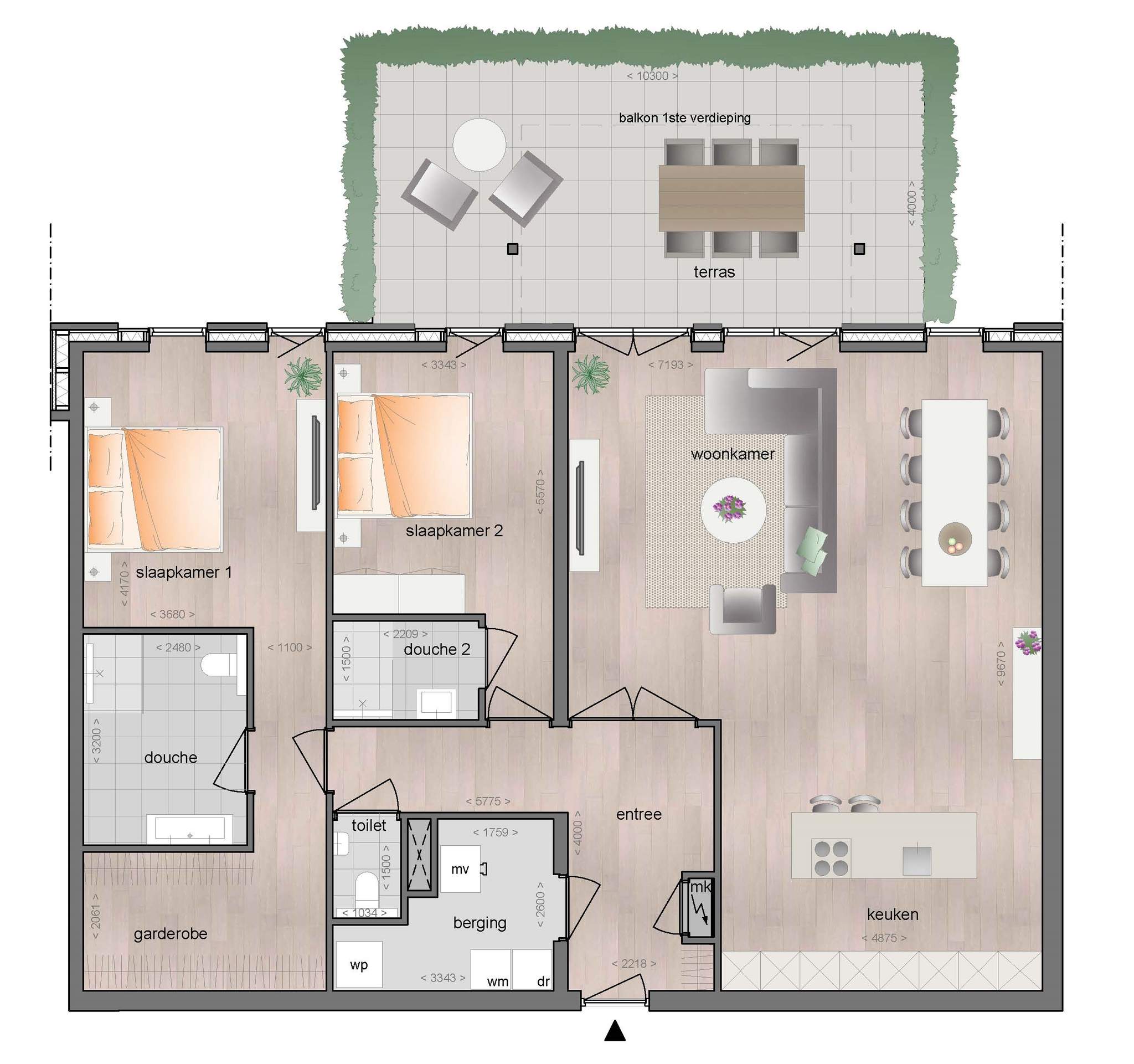 De begane grond steekt circa één meter boven het maaiveld uit, de 6 appartementen op deze bouwlaag hebben hierdoor extra privacy en een mooi uitzicht. Ieder appartement kent een andere indeling en formaat waardoor de keuze groot is. De bijbehorende terrassen zijn groot van formaat.