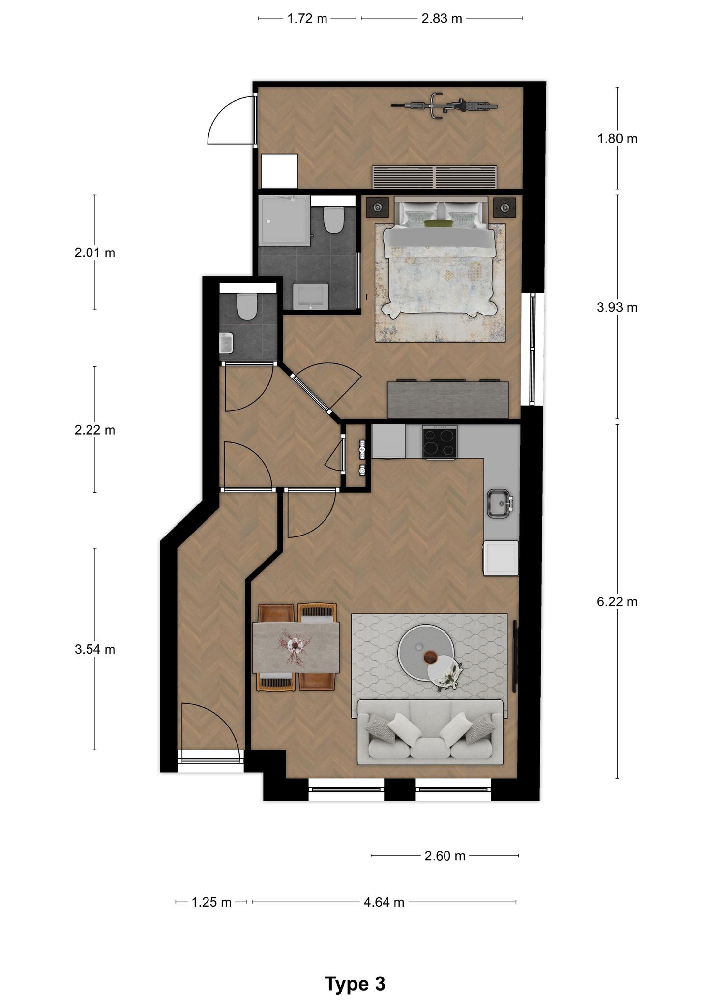 Aan de rechterzijde van het gebouw bevindt zich de slaapkamer, groot genoeg voor een tweepersoonsbed en een garderobekast. De badkamer wordt ingedeeld met een douche, toilet en een wastafel.