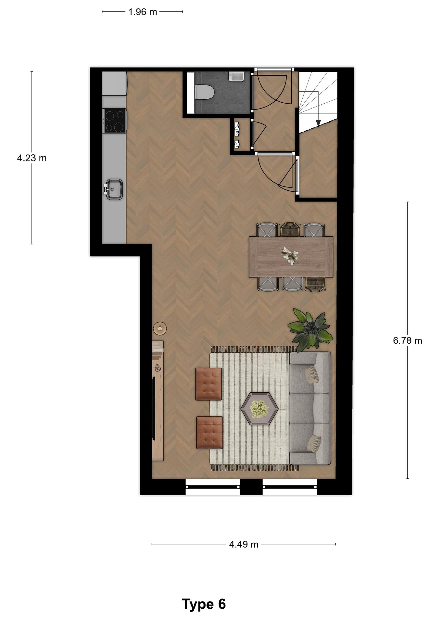 De maisonnettes zijn te bereiken via een buitentrap en een ruime, gezamenlijke hal. Deze maisonnette van ca. 92.3 m2 bevindt zich aan de voorzijde van het gebouw, met mooi uitzicht naar de Hoofdstraat. Vanuit de hal van de maisonnette zijn de woonkamer met open keuken en de toiletruimte te bereiken.