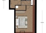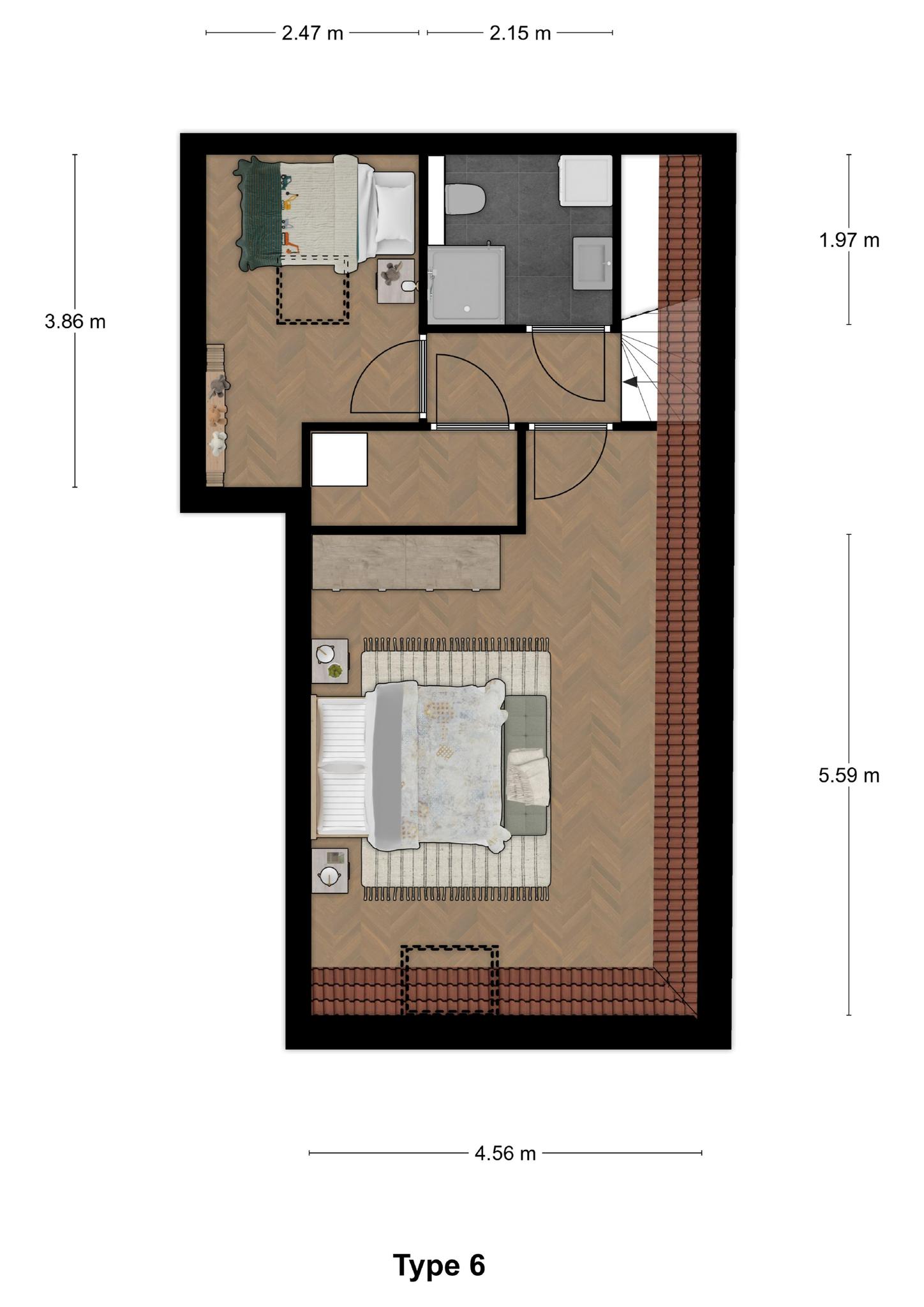 De tweede verdieping wordt als een open ruimte opgeleverd met aansluitingen en ruimte voor de badkamer en slaapkamer(s). De badkamer is ingetekend met een douche, wastafel, wandcloset en de wasmachineaansluiting.