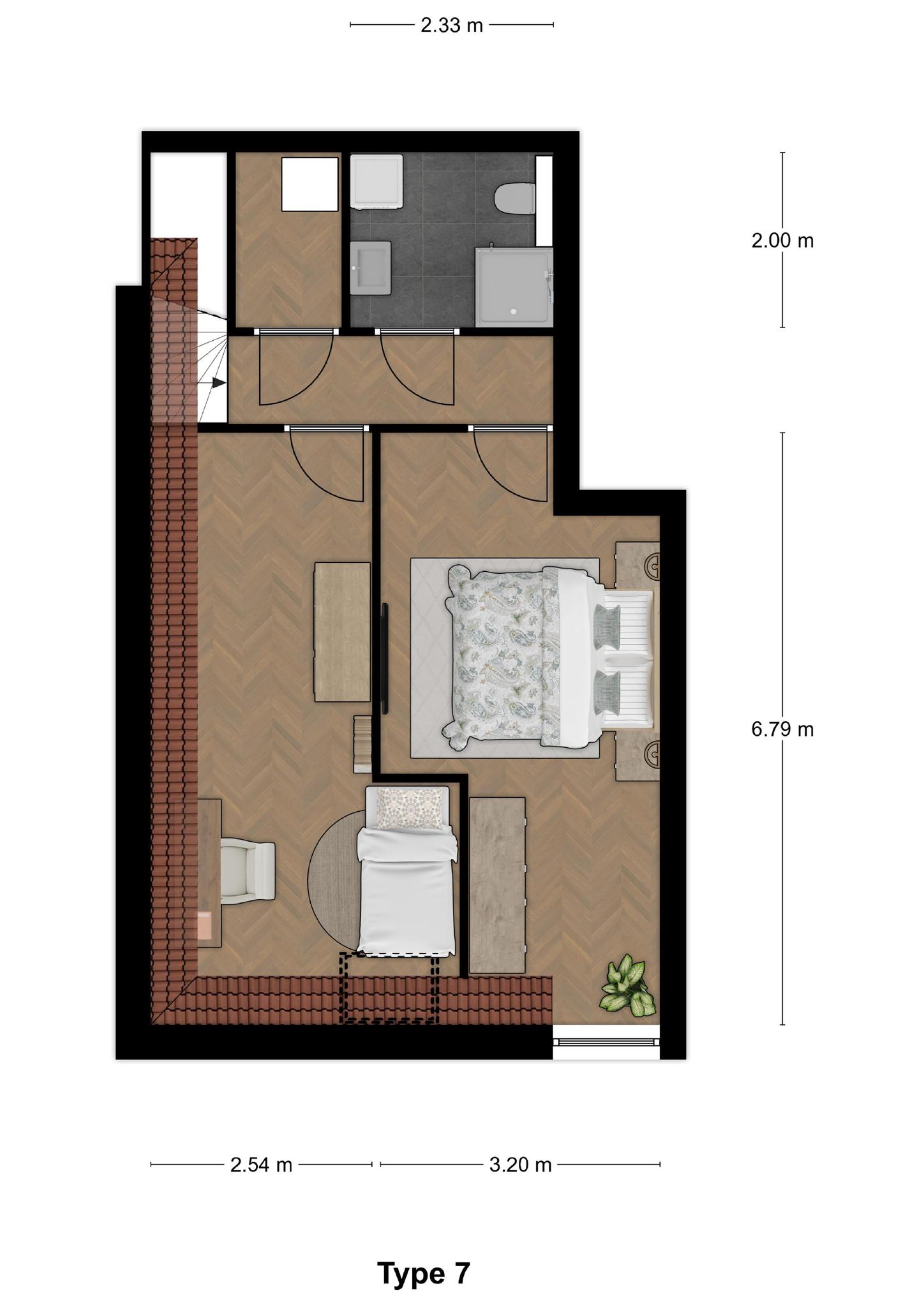 De tweede verdieping wordt als een open ruimte opgeleverd met aansluitingen en ruimte voor de badkamer en slaapkamer(s). De badkamer is ingetekend met een douche, wastafel, wandcloset en de wasmachineaansluiting.