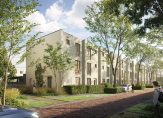 Direct achter het historische Shellgebouw en rondom de vijver, waar vroeger het legendarische zwembad Sportpark Vijfsluizen lag, komen 38 gezinswoningen. Ze hebben een statige uitstraling, die qua look en feel in het verlengde ligt van het monument. De lichte architectuur met
