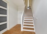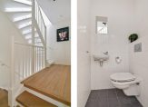 Via een vaste trap met eiken houten trapdelen kom je op de overloop. Via een klein niveauverschil kom je bij de toiletruimte en de trap naar de verdieping. Het toilet is modern afgewerkt met antraciet grijze vloertegels en witte wandtegels. In het toilet is een vrijhangend toilet en een fontein aanwezig.