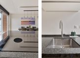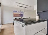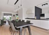 De fantastische leefkeuken bevindt zich aan de voorzijde. Er is voldoende ruimte voor een grote eettafel, waar u met uw gasten heerlijk kunt tafelen. De keuken is modern uitgevoerd met witte fronten en een donker natuurstenen aanrechtblad. De keuken bestaat uit twee delen, waarvan een schiereiland met fraai verlengd aanrechtblad. Zo wordt het eetgedeelte nog meer bij de keuken getrokken. In de keuken treft u volop bergruimte en de volgende inbouwapparatuur: