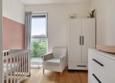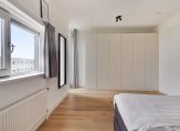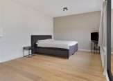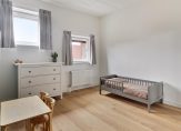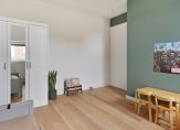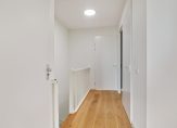 De gehele verdieping is strak afgewerkt met gladde wanden en een massief houten vloer.