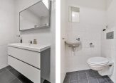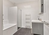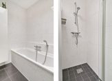 De badkamer heeft fijn daglicht door middel van een grote lichtkoepel. Zo heeft u bijna nooit verlichting nodig! De moderne en ruime badkamer is afgewerkt met antraciet grijze vloertegels en witte wandtegels en is voorzien van een wastafelmeubel, designradiator, douche en ligbad.