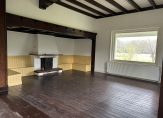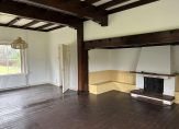*sfeervolle woonkamer met authentieke schouw en haard, hoge plafonds met balken en houten vloeren.