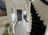 Hal met de trapopgang naar de tweede verdieping, woonkamer, keuken en badkamer met toegang tot het dakterras.