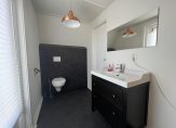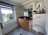 De moderne badkamer meet respectievelijk 6 m² en is uitgerust met een dubbele wastafel, inloopdouche en toilet. Ventilatie geschiedt op natuurlijke wijze.