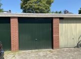 Stenen garagebox met stalen kanteldeur, gelegen aan een niet voor doorgaand verkeer bestemd plein.