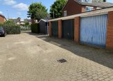 Stenen garagebox met dubbele houten deur voorzien van driepuntssluiting, gelegen aan een niet voor doorgaand verkeer bestemd plein.