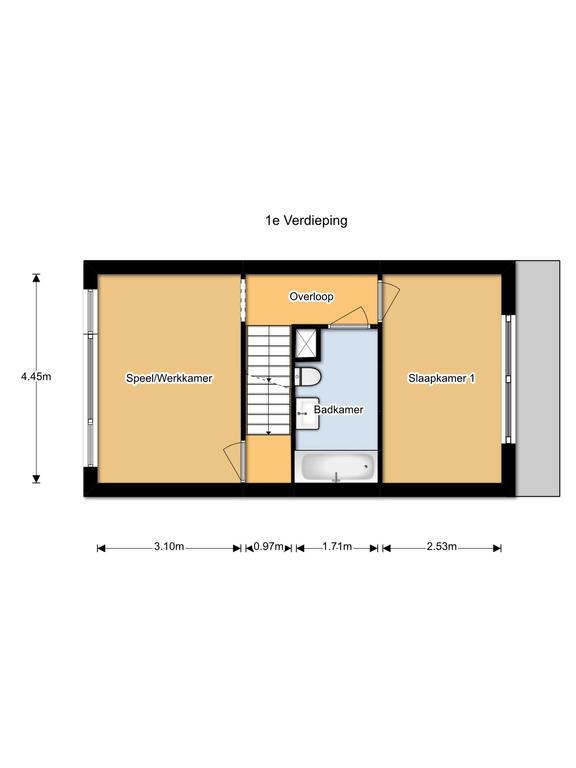 Werk-/ speelkamer of slaapkamer, tussenhal met toegang tot badkamer en ruime slaapkamer. Badkamer voorzien van ligbad, wandcloset en badkamermeubel met wastafel.