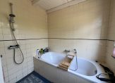 De volledig betegelde badkamer is royaal opgezet en uitgerust met een douche, ligbad en een enkele wastafel.