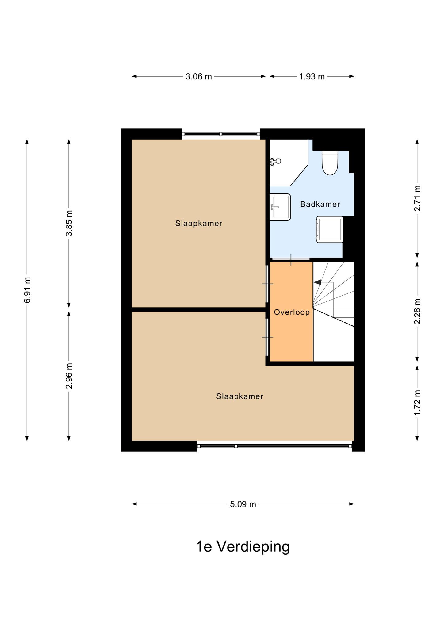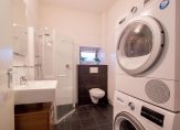 2e Etage: riante badkamer met inloopdouche, voorzien van glazen spatschermen. Luxe wastafel met ladenmeubel, handdoekenradiator en tweede toilet. Aansluitingen wasmachine en -droger. Slaapkamer (< 12 m2). Tweede L-vormige slaapkamer (< 12,5 m2).
