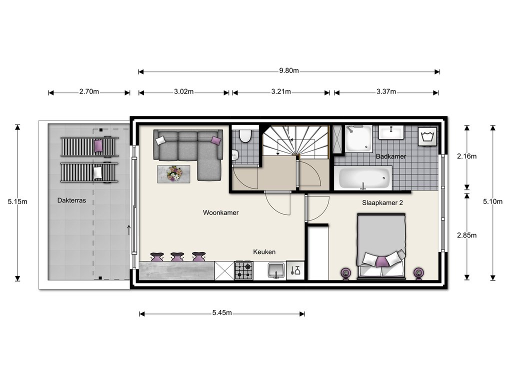 Indeling: entree / gemeenschappelijke hal / trap naar 1e verdieping: ruime en lichte woonkamer met open keuken en schuifpui naar dakterras, dit dakterras is ca. 14 m2 en is grotendeels overdekt door het balkon van de 2e verdieping waardoor er een soort veranda ontstaat / de nieuwe keuken is voorzien van een 90 cm inductie kookplaat, afzuigkap, vaatwasser, combi oven en koelkast / toilet / slaapkamer / luxe badkamer met ligbad, inloopdouche, dubbele wastafel en was-/droogaansluiting