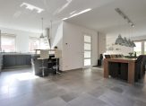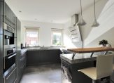 Indeling: grote hal met deur naar kelder, royale woonkamer met veel lichtinval, dubbele deuren naar veranda en tuin, open haard, open keuken met zeer luxe antraciet kleurige inrichting, granieten werkblad en eetbar, luxe inbouwapparatuur. De gehele begane grond is v.v. antraciet tegelvloer met vloerverwarming. Achterentree, gang en inpandige garage met bergzolder en elektrische deur.