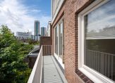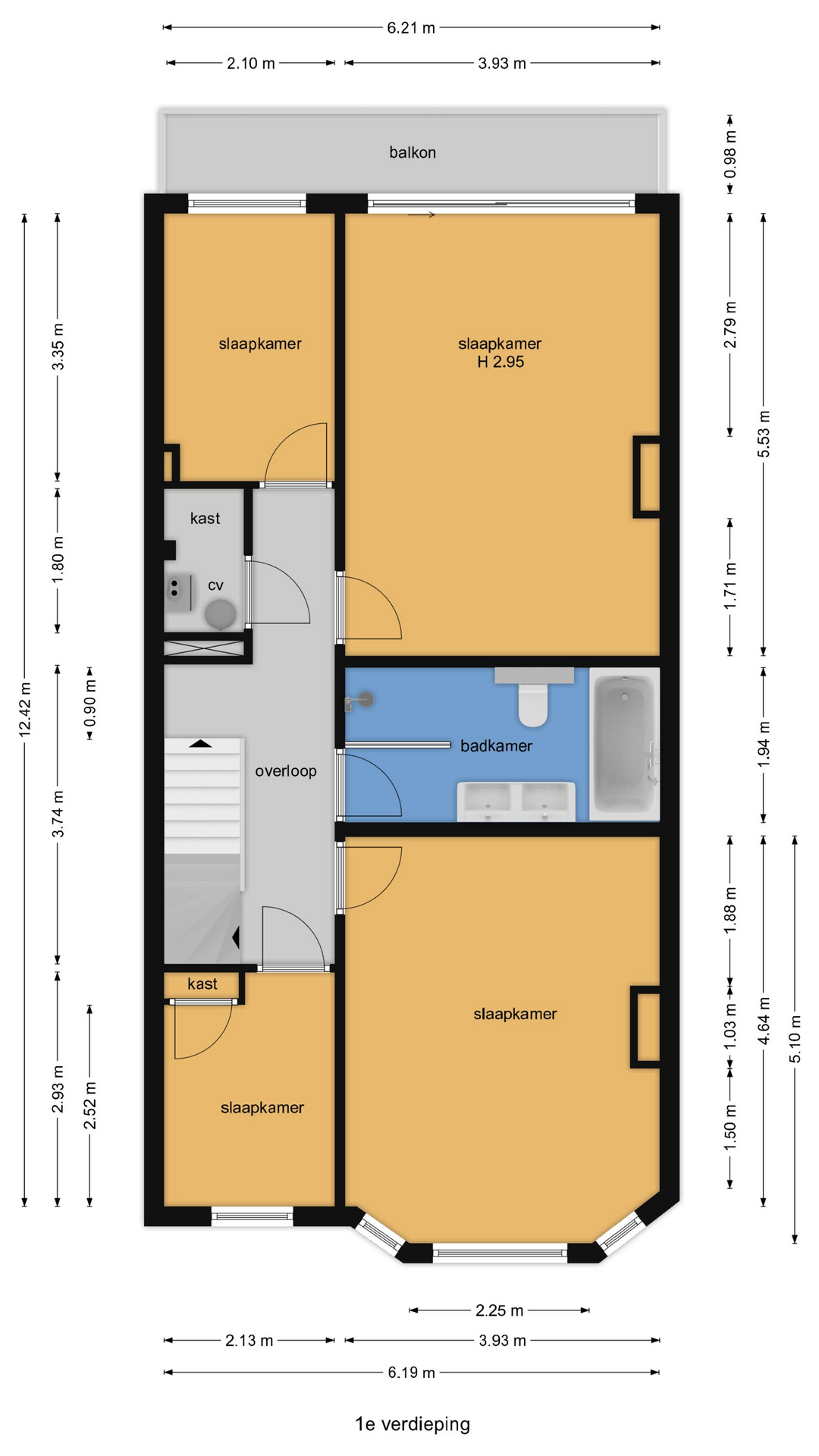 Vanuit de hal de trap naar de 1e etage, overloop voorzien van technische ruimte met cv-ketel en opstelplaats voor de wasmachine, zijkamer aan de voorzijde, zijkamer aan de achterzijde, riante slaapkamer aan de achterzijde met balkon over de volle breedte op de ochtend- en middagzon, riante slaapkamer aan de voorzijde met erker en tussen gelegen badkamer voorzien van inloopdouche met glazen wand, badkamermeubel met onderkasten, wandcloset en ligbad.