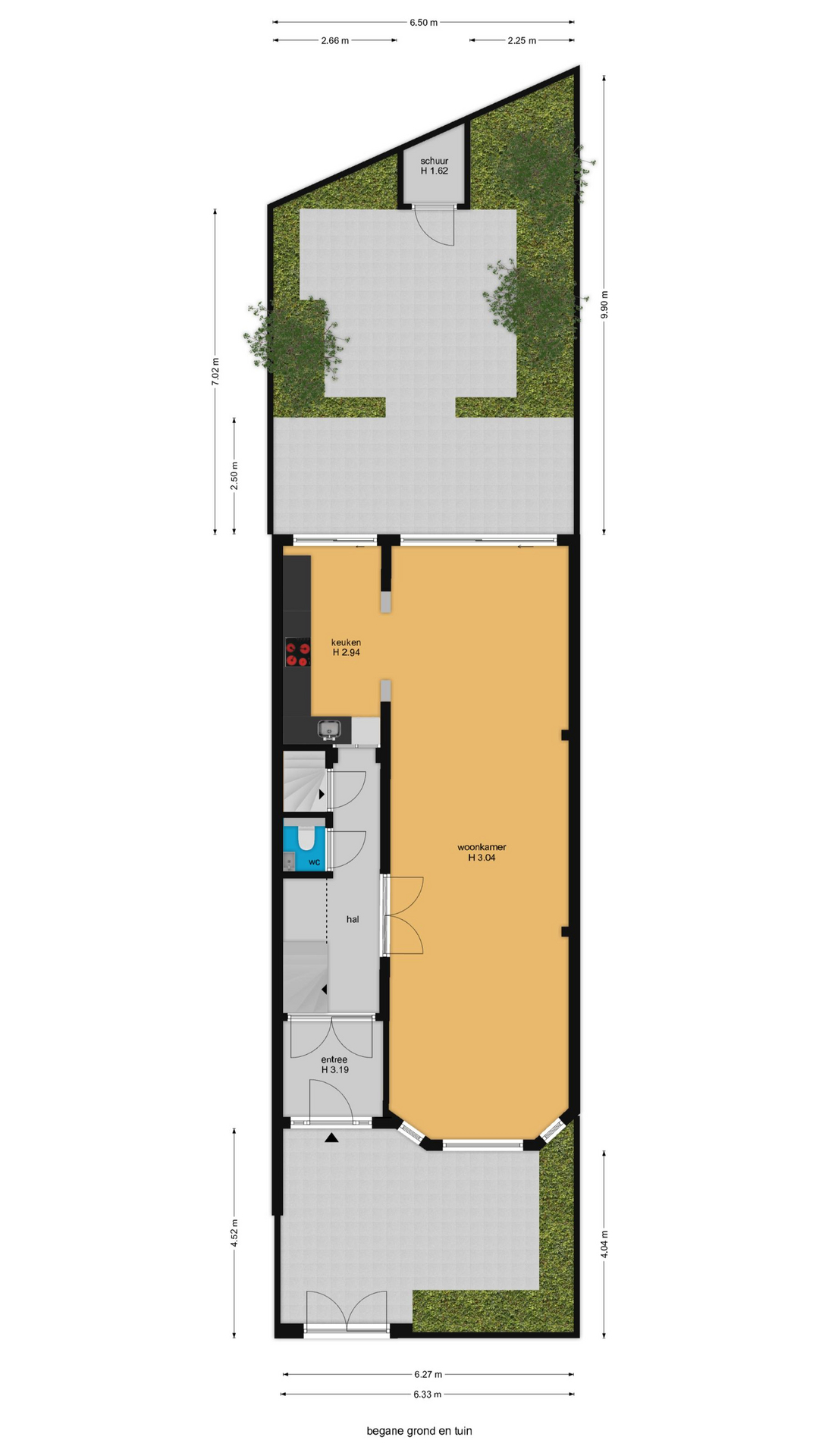 Ruime voortuin, entree met vestibule, tochtdeur met glasroedeverdeling naar de gang met toilet en deur naar kelder. De kelder is voorzien van veel bergruimte, meterkast en sauna. De begane grond is voorzien van lamelparketvloeren, erker aan de voorzijde, schuifpui naar de achtertuin met stenen berging en open keuken voorzien van composiet werkblad, koelkast, combimagnetron, inductiekookplaat en vaatwasser.