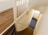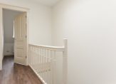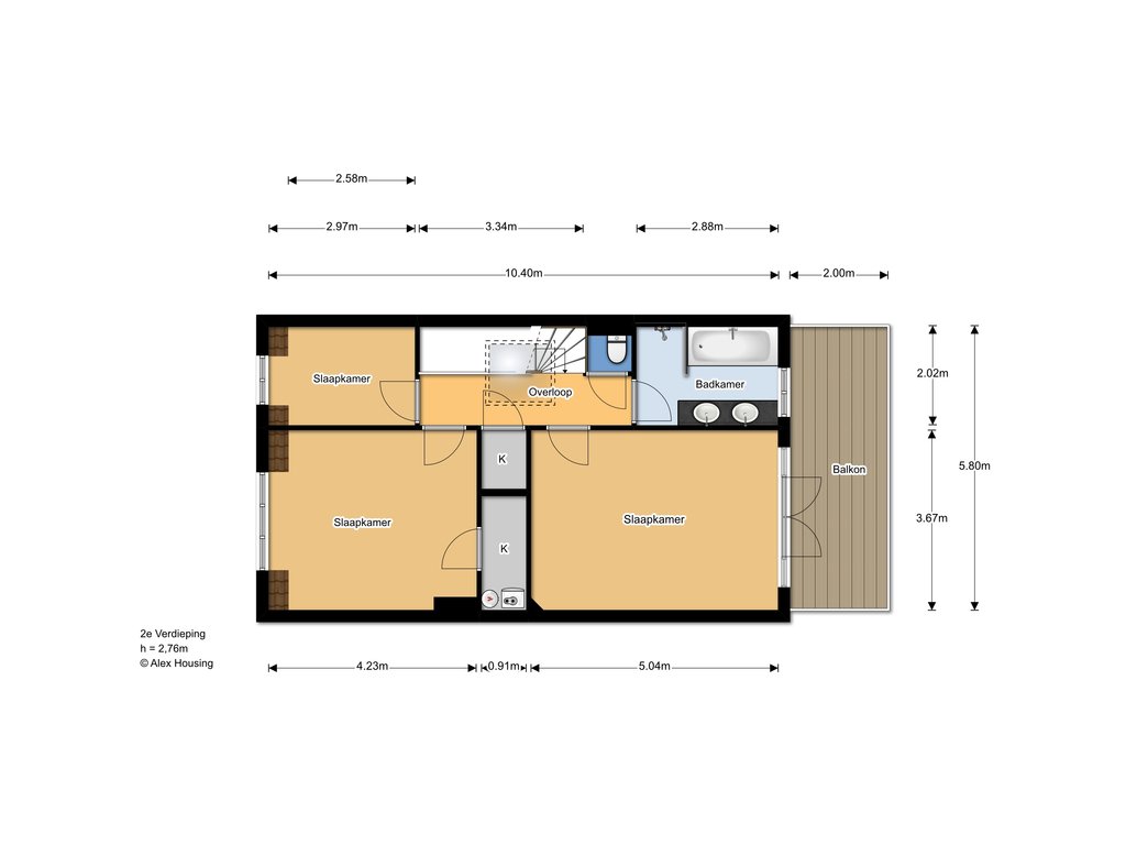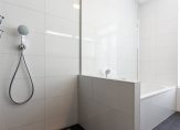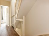 Trap naar 2e verdieping, overloop met dakraam, toilet, kast met wasmachine en droger, luxe badkamer met aparte douche, ligbad en meubel met twee wastafels en laden, ruime ouderslaapkamer met openslaande deuren naar het zonnige balkon, 2e slaapkamer met grote bergkast, voorzijkamer.