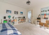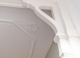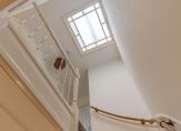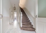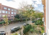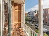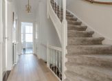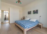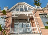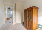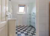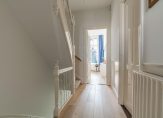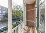 Trap naar 1e etage, overloop, apart toilet, ruime badkamer ca. 3.58×2.20 voorzien van ligbad, aparte douche en wastafelmeubel (huidige wordt vervangen voor een nieuw meubel), zeer ruime achterslaapkamer ca. 4.92×4.03 met vaste kast, ruime voorkamer ca. 5.82×3.83 met vaste kast, boekenkastenwand en openslaande deuren naar veranda ca. 3.83×1.00, voorzijkamer ca. 3.81×2.20.