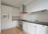 Entree op straatniveau met hal en trap naar de eerste verdieping, overloop, toilet met fontein, extra halletje met garderobekasten, ruime lichte L-vormige woonkamer met erker aan de voorzijde en aan de achterzijde openslaande deuren naar het ruime terras, ruime keuken voorzien van inbouw apparatuur.