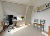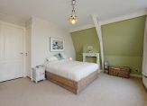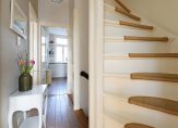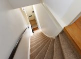 Trap naar 1e verdieping met overloop en 2 ruime slaapkamers, luxe badkamer met douche, wastafel en toilet.