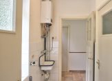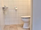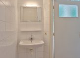 Badkamer voorzien van douchehoek en vaste wastafel in een frisse kleurstelling. Toilet met fontein, eveneens in lichte kleurstelling. Bijkeuken met aansluiting wasautomaat, uitstortgootsteen en de plaatsing van de NEFIT Hoog Rendement CV-combiketel van 2024.