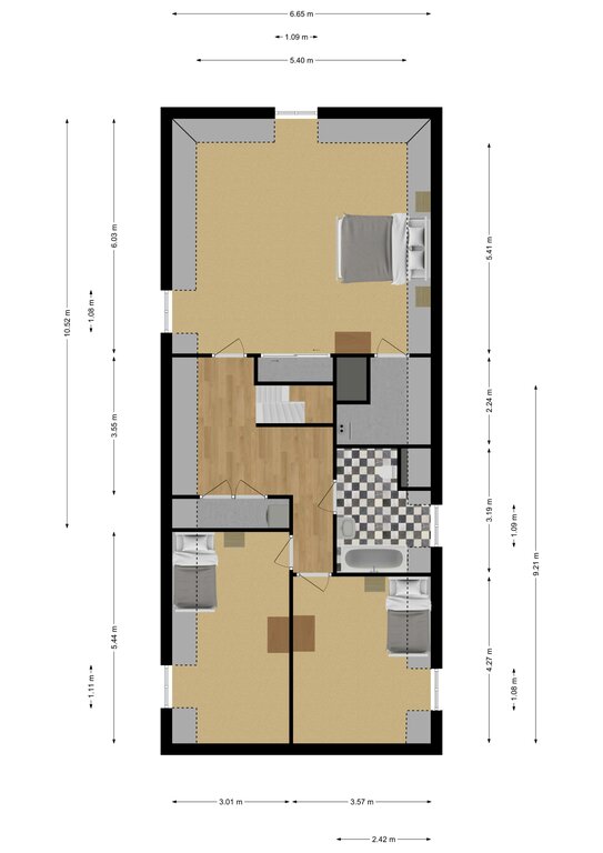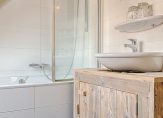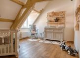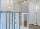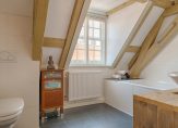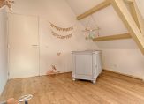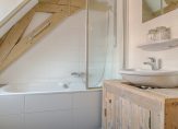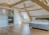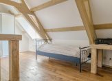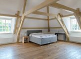 Overloop met toegang tot de drie slaapkamers waarvan een met vaste kastenwand en de badkamer. Ook hier springen de hoge plafonds en de balken in het oog waardoor de ruimtes nog groter lijken dan ze al zijn. De badkamer is voorzien van een wastafel met meubel, bad/douche combinatie en een 2e toilet.