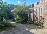 De achtertuin is gelegen op het zuidwesten en beschikt over een achterom en een houten berging. De woning beschikt over een eigen parkeerplaats op het binnenterrein.