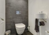 royale hal met garderobe, luxe toilet, woonkamer met zwarte tegelvloer en vloerverwarming en uitzicht over de gracht,