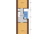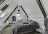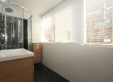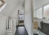 overloop met ruimte voor de wasmachine en droger; sfeervolle ouderslaapkamer met hoog plafond en dakraam; slaap/hobbykamer met vaste kasten en balkon; ruime badkamer met luxe douchecabine en wastafelmeubel.