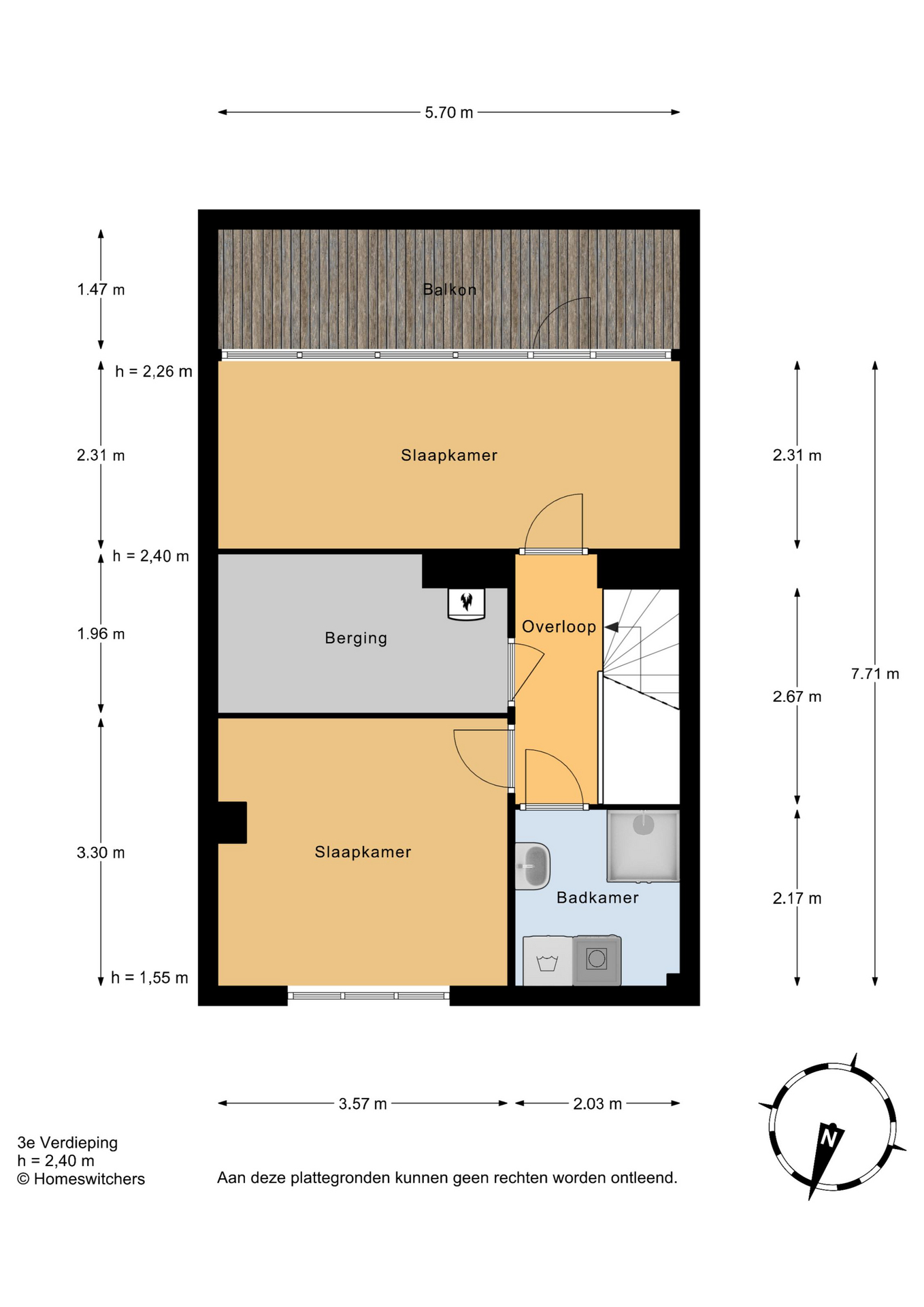 De de derde etage heeft een ruimte slaapkamer aan de achterzijde met terras over de volle breedte, een slaapkamer aan de voorzijde, een badkamer met douche, wastafel en opstelplaats voor wasmachine en wasdroger. Tenslotte een tussengelegen bergruimte met opstelplaats CV-ketel.