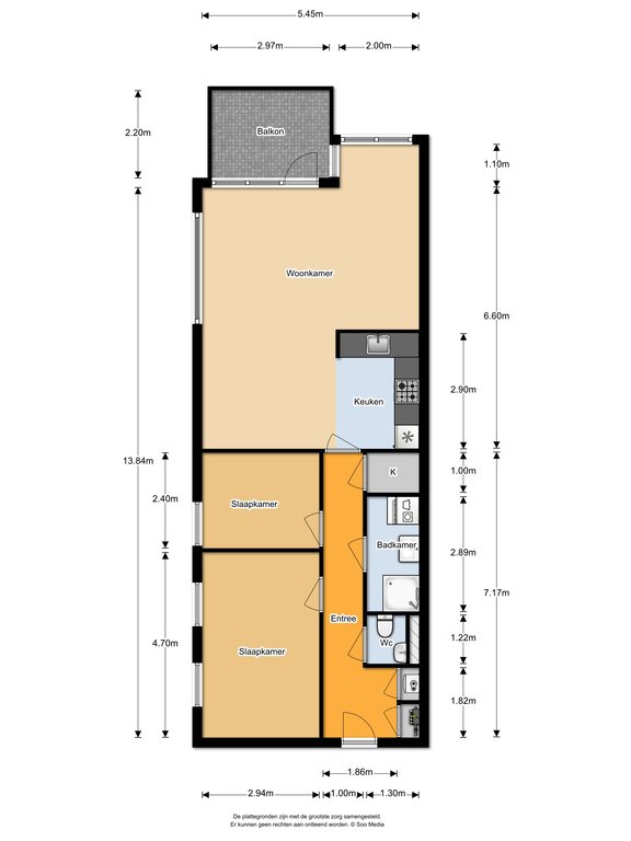 De gebruiksoppervlakte wonen is exclusief het balkon van 7 m² en de berging van 5 m².
