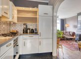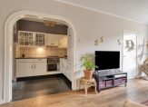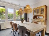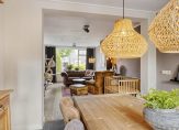 Als je in de woonkamer staat, is de kans groot dat er grote glimlach op je gezicht verschijnt. De totale lengte is maar liefst 10 meter, met het zitgedeelte bij de houtkachel en het eetgedeelte bij de pui met openslaande tuindeuren. De parketvloer toont karakter en de warme kleuren zorgen voor een woonkamer met sfeer.